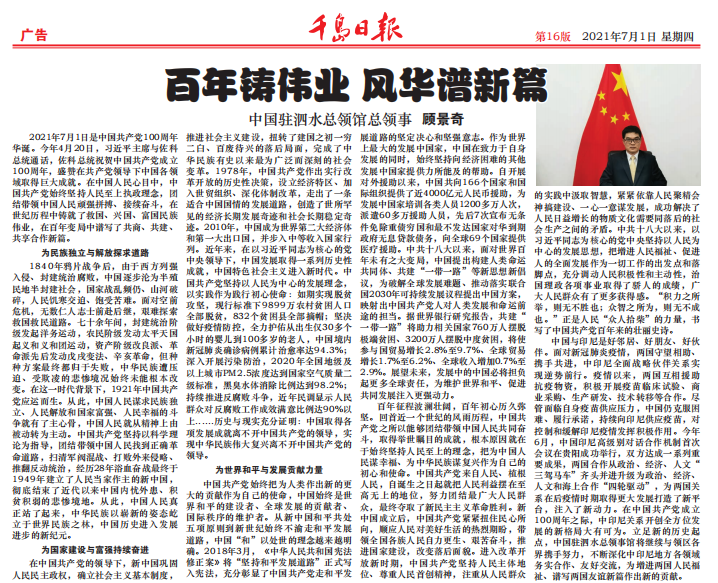 据中国驻泗水总领馆7月1日消息,7月1日,驻泗水总领事顾景奇在《千岛日报》发表题为《百年铸伟业 风华谱新篇》的署名文章,介绍中国共产党百年辉煌历程及中印尼在抗疫合作下两国友好关系发展近况。全文内容如下: