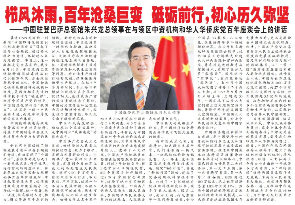 会后,朱总领事在当地华文媒体发表了题为《栉风沐雨百年沧桑巨变砥砺前行初心历久弥坚》的署名文章。