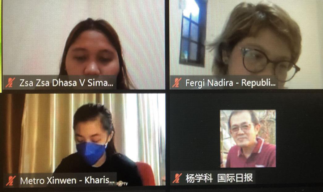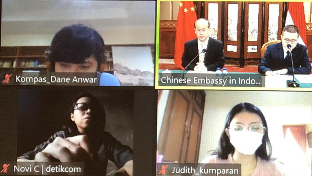 使馆石资明公参、易凡平参赞、政治处副主任臧亮等参加记者会并就中国劳工入境印尼、科兴疫苗有效性、中国航天工程、南海、涉疆、中国减贫经验等问题回答提问。