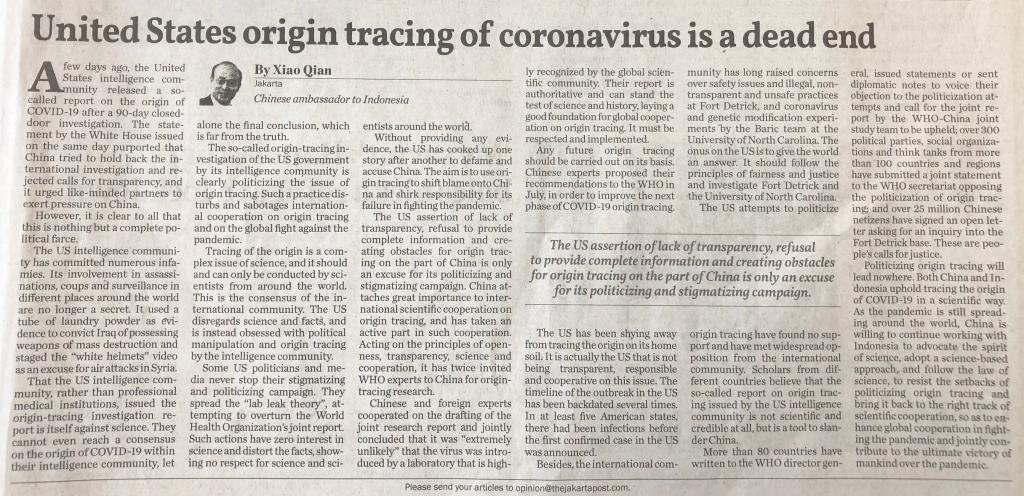 据中国驻印尼大使馆9月10日消息,9月10日,肖千大使在印尼《雅加达邮报》发表署名文章《“情报溯源”可以休矣》,揭批美国情报部门搞病毒溯源的闹剧,阐明中方在病毒溯源有关问题上的严正立场。全文内容如下: