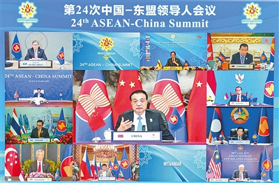 李克强表示,当前中国—东盟关系健康稳定发展,各领域务实合作持续推进。去年以来,习近平主席与东盟国家领导人通过多种方式进行深入战略沟通。今年是中国东盟建立对话关系30周年。30年来,双方坚持讲信修睦、互利共赢,支持多边主义,维护了地区总体稳定和经济持续增长。面对新冠肺炎疫情冲击,中国东盟守望相助,相互支持,双方关系得到进一步巩固。