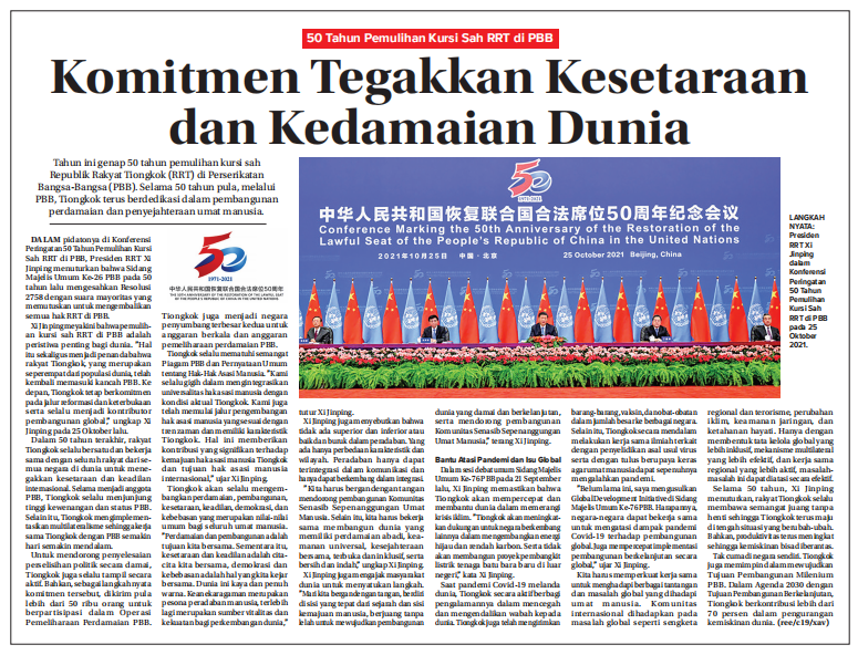 据中国驻泗水总领馆11月5日消息,11月4日,中国驻泗水总领馆在印尼发行量最大的印尼文报纸《爪哇邮报》以《维护世界平等与和平的承诺》为题刊文,介绍中国坚定不移维护世界和平与发展的贡献与决心。文章主要内容如下: