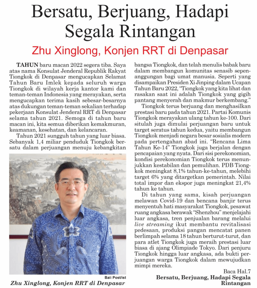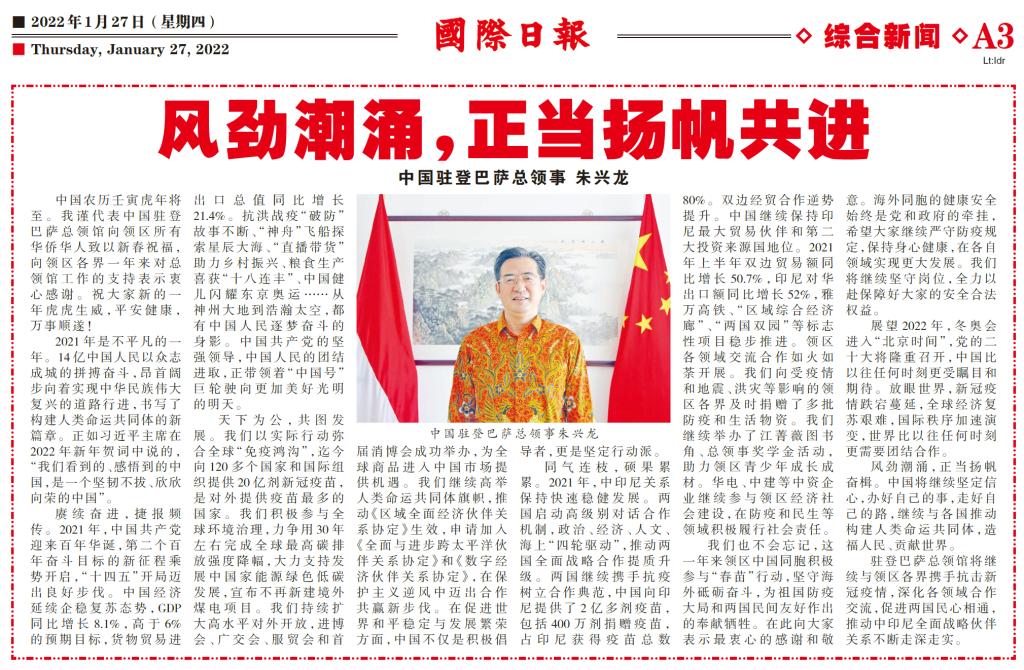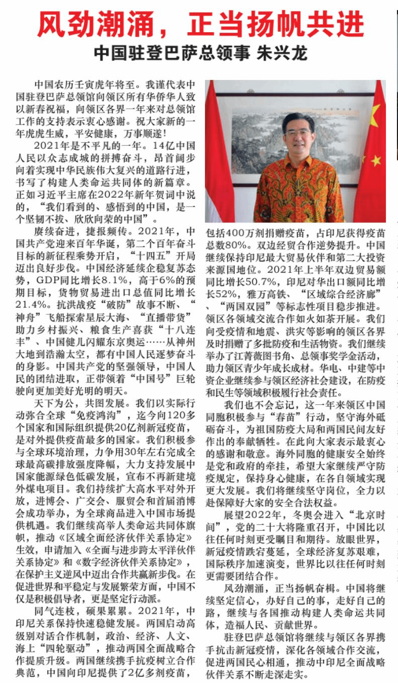 据中国驻登巴萨总领馆1月31日消息,在虎年新春到来之际,驻登巴萨总领事朱兴龙在《巴厘邮报》、《国际日报》和《千岛日报》上发表署名文章《风劲潮涌,正当扬帆共进》,全文如下: