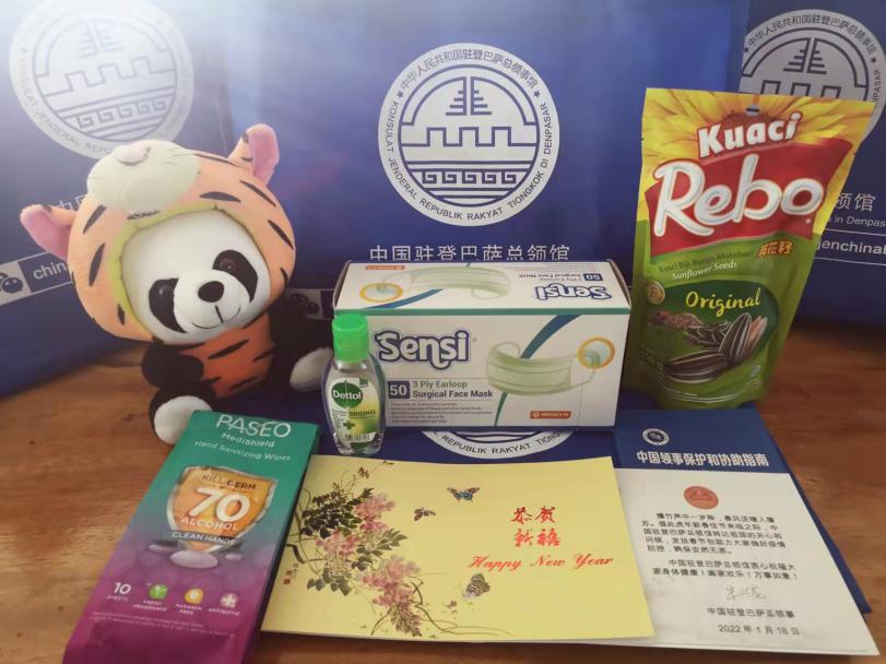 据中国驻登巴萨总领馆1月27日消息,新春佳节将至,1月25日,中国驻登巴萨总领馆通过快递向领区内100余名中国公民发放精心准备的“春节包”。包内有包括总领事签名的新年贺卡、口罩、洗手液、消毒湿巾等防疫物资和新年慰问品。