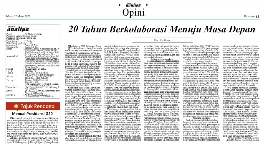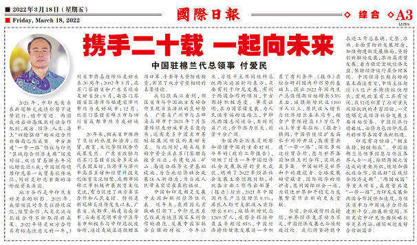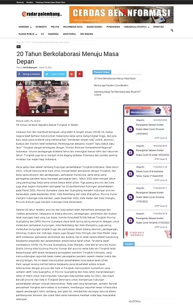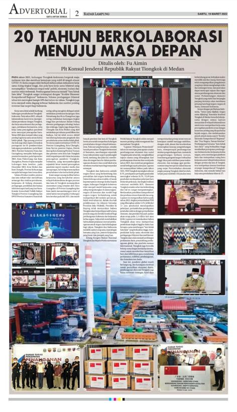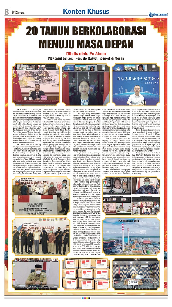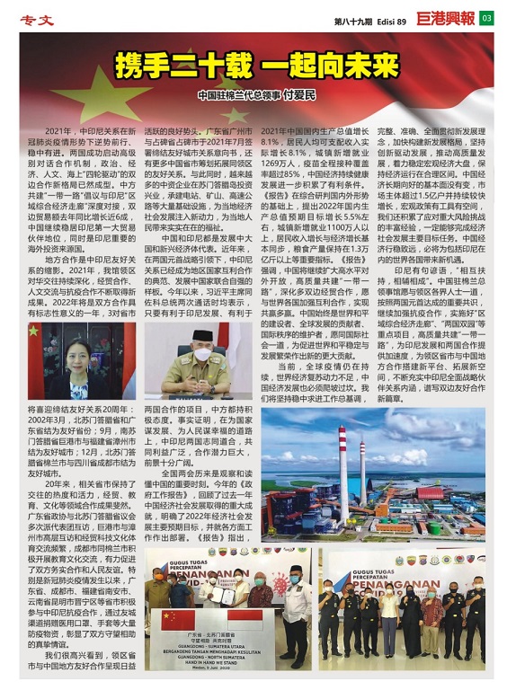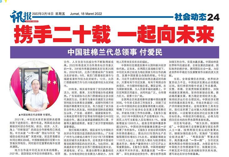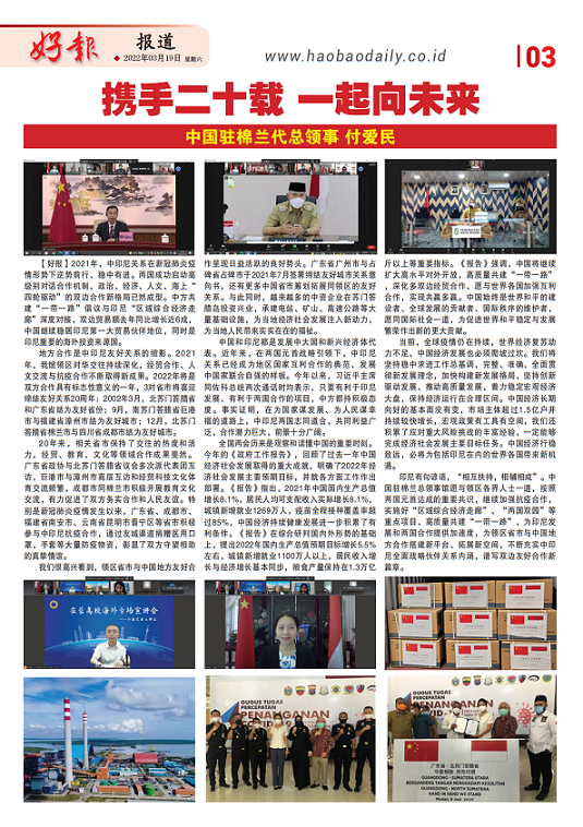 据中国驻棉兰总领事馆3月22日消息,3月18日至22日,驻棉兰代总领事付爱民在领区印尼文媒体《分析日报》(Analisa Daily)、《楠榜雷达报》(Radar Lampung)、《楠榜论坛报》(Tribun Lampung)、《巨港雷达报》(Radar Palembang)及华文媒体《国际日报》中印尼文版、《讯报》、《好报》、《巨港兴报》等发表题为《携手二十载 一起向未来》的署名文章,回顾领区与中国省市友城关系发展成果,并介绍2022年中国全国两会情况。全文如下: