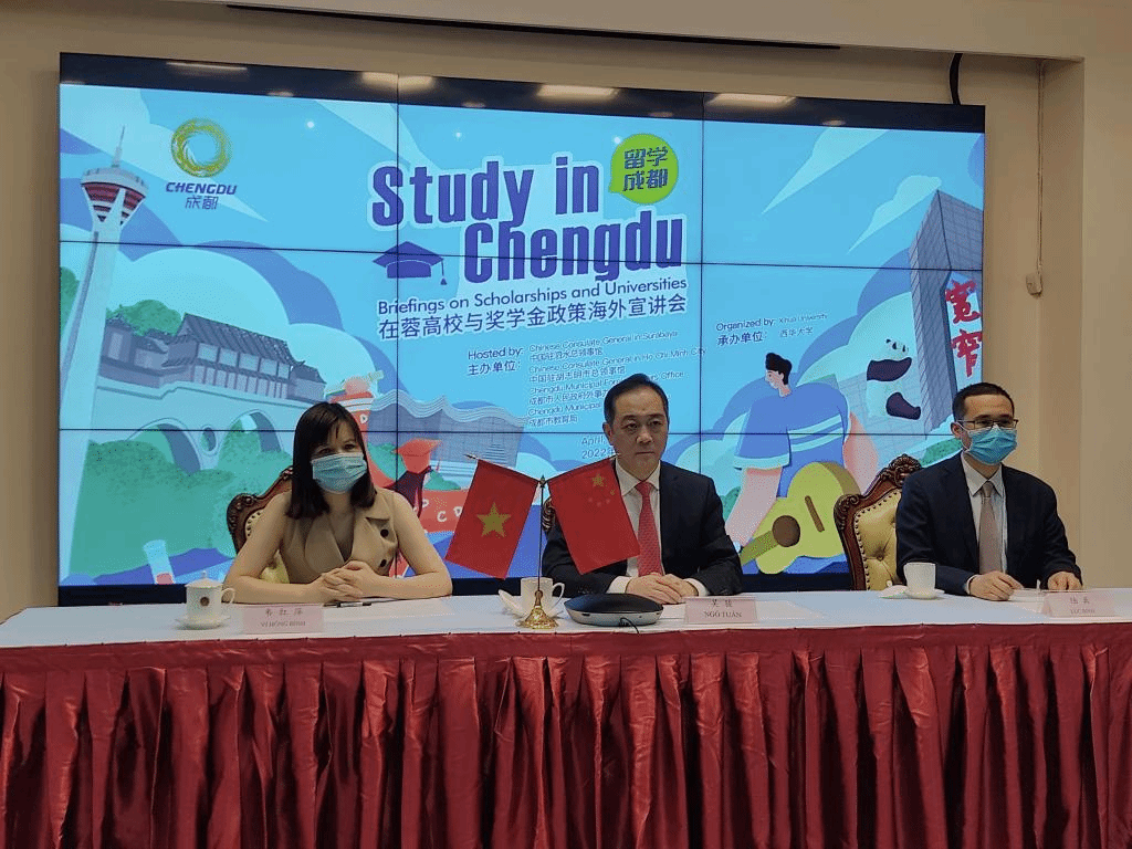 据中华人民共和国驻泗水总领事馆4月13日消息,4月8日,成都市人民政府外事办公室、成都市教育局联合中国驻泗水总领馆、中国驻胡志明市总领馆,共同举办以“留学成都”为主题的在蓉高校与奖学金政策海外宣讲会。宣讲会采用视频会议形式,共11所在蓉高校面向印尼、越南参会师生介绍招生与奖学金政策。中国驻泗水总领事顾景奇,中国驻胡志明市总领事吴骏,成都市人民政府外事办公室主任姜斌、副主任欧玉松,成都市人民政府总督学石斌出席宣讲会。