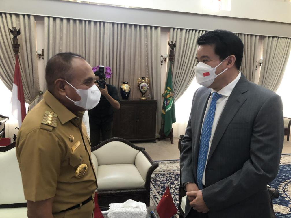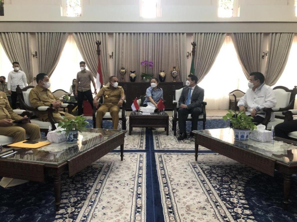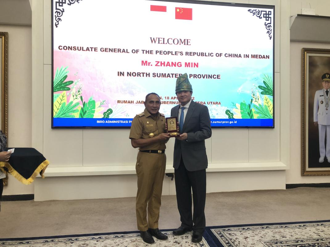 据中华人民共和国驻棉兰总领事馆4月18日消息,4月18日,中国驻棉兰总领事张敏到任拜会北苏门答腊省(苏北省)省长艾迪·拉玛雅迪。省长助理菲迪尤斯、省经济局局长纳斯林多、苏北华联执行主席徐煜权等参加。