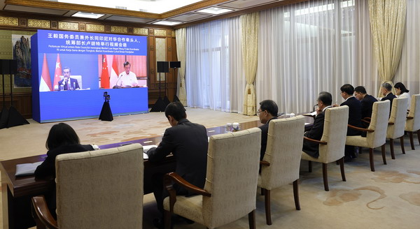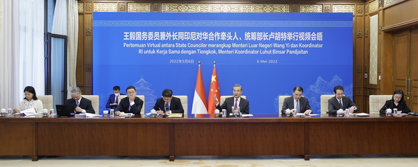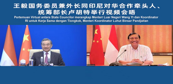 据中华人民共和国驻印度尼西亚共和国大使馆5月6日消息,5月6日,国务委员兼外长王毅同印尼对华合作牵头人、统筹部长卢胡特举行视频会晤。