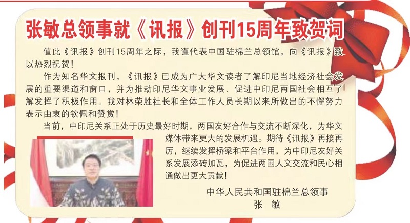 据中华人民共和国驻棉兰总领事馆5月21日消息,5月21日,中国驻棉兰总领事张敏通过视频方式就领区华文媒体《讯报》创刊15周年致贺词。