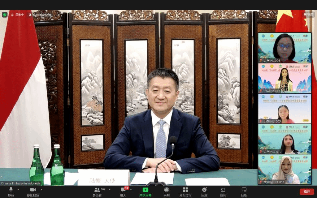 据中华人民共和国驻印度尼西亚共和国大使馆6月24日消息,6月24日,第二十一届“汉语桥”大学生、第十五届“汉语桥”中学生和第二届“汉语桥”小学生世界中文比赛印尼赛区总决赛颁奖典礼在线成功举行,活动由中国驻印尼使馆主办,雅加达华文教育协调机构和阿拉扎大学孔子学院联合承办。中国驻印尼大使陆慷,阿拉扎大学校长阿瑟普出席。社会各界人士在线观看了颁奖典礼。
