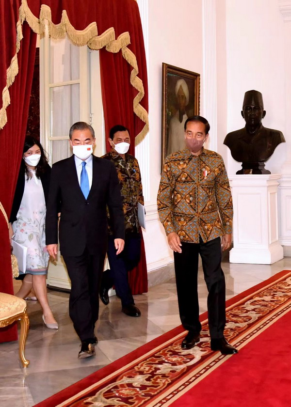 据中华人民共和国驻印度尼西亚共和国大使馆7月12日消息,7月11日,印尼总统佐科在雅加达会见正在印尼访问的国务委员兼外长王毅。