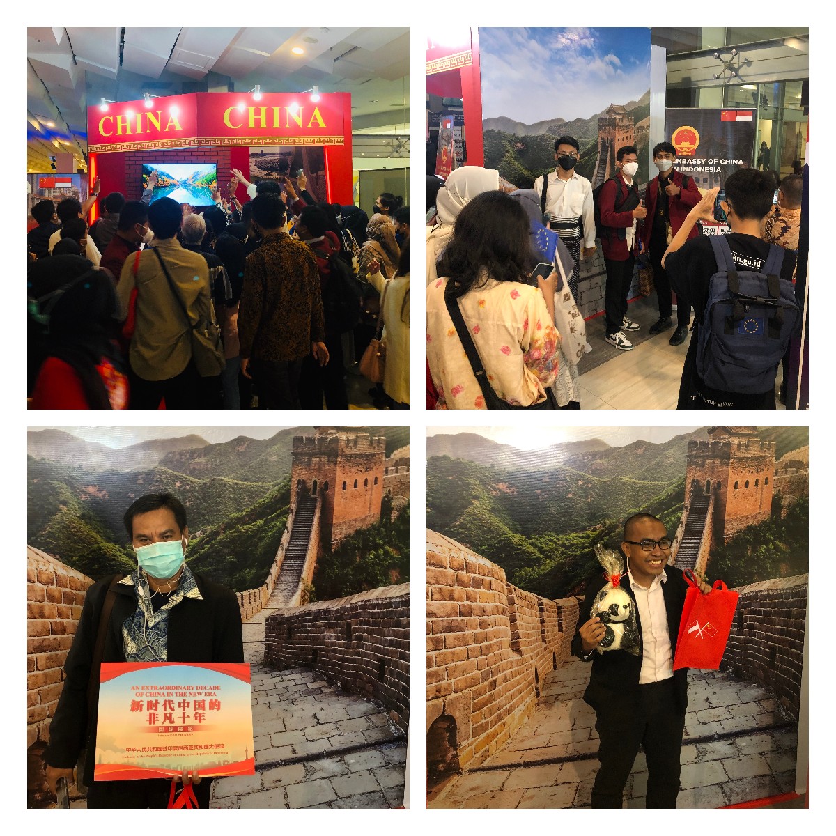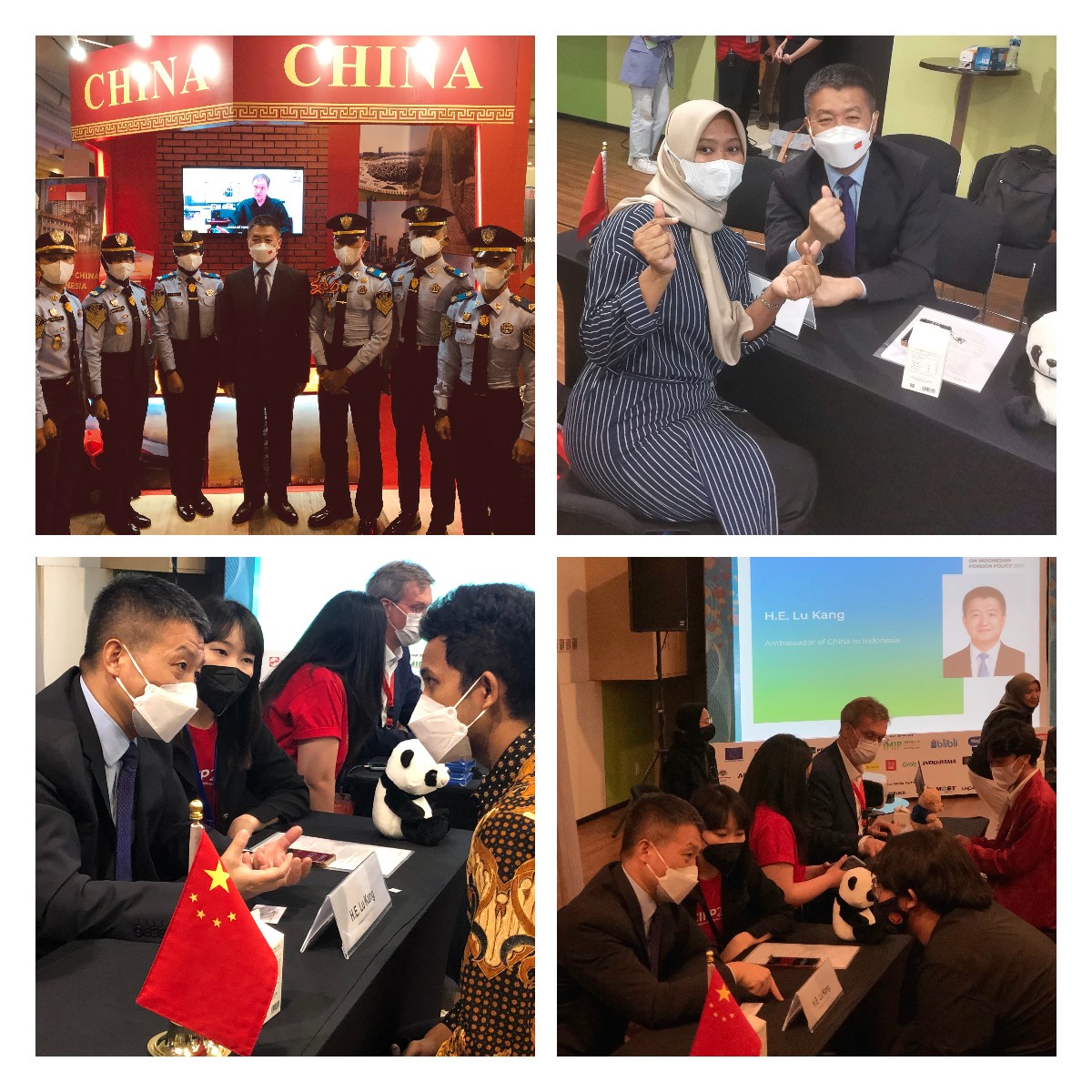 驻印尼使馆在大会现场搭设富有中国特色的展台,播放关于中国发展成就和中印尼友好合作成果的宣传片,向与会者赠送《新时代中国的非凡十年》画册等纪念品,吸引大批与会嘉宾驻足参观。