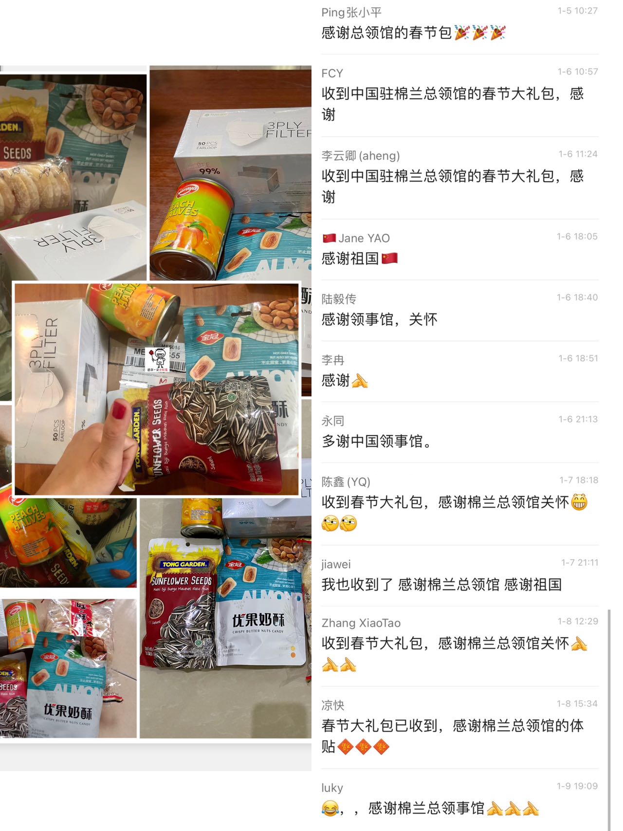 总领馆还通过邮寄方式向领区中国公民和企业发放了春节包,同胞们在收到春节包之后,都难掩喜悦,纷纷在同胞群内“晒包”,表达对祖国的感激之情。