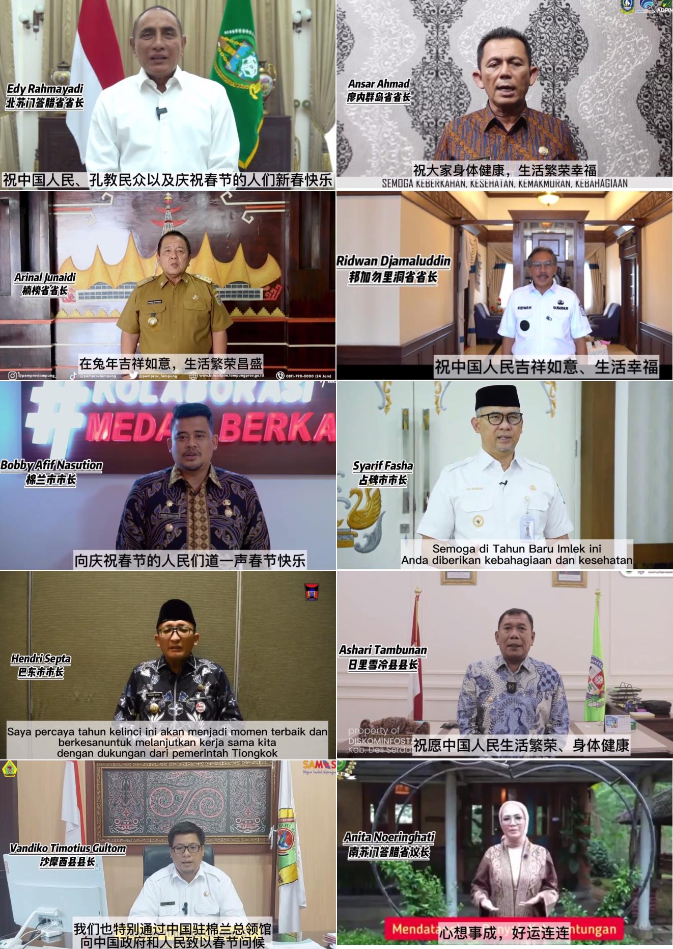 领区省市县政要在视频致辞中表示,印尼与中国友好关系历久弥新,希望两国全面战略伙伴关系持续深化,双边友好交流和务实合作不断加强,祝愿中国繁荣昌盛!祝愿中国政府和人民春节快乐、兔年大吉!
