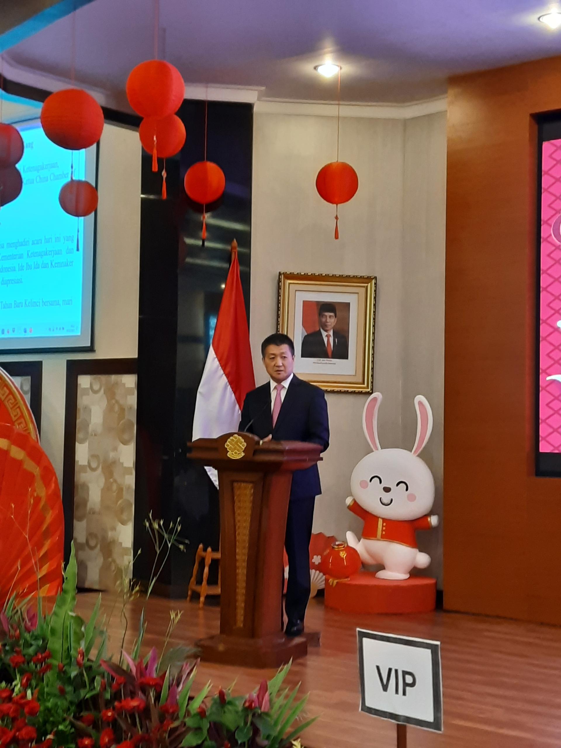 据中华人民共和国驻印度尼西亚共和国大使馆2月20日消息,2月20日上午,陆慷大使应邀出席印尼劳工部与印尼中国商会总会共同举办的联谊活动。印尼劳工部长伊达、印尼中国商会总会主席张朝阳、印尼工商会馆和企业家协会副主席欣达等中印尼政、商和劳工界代表上百人参加。