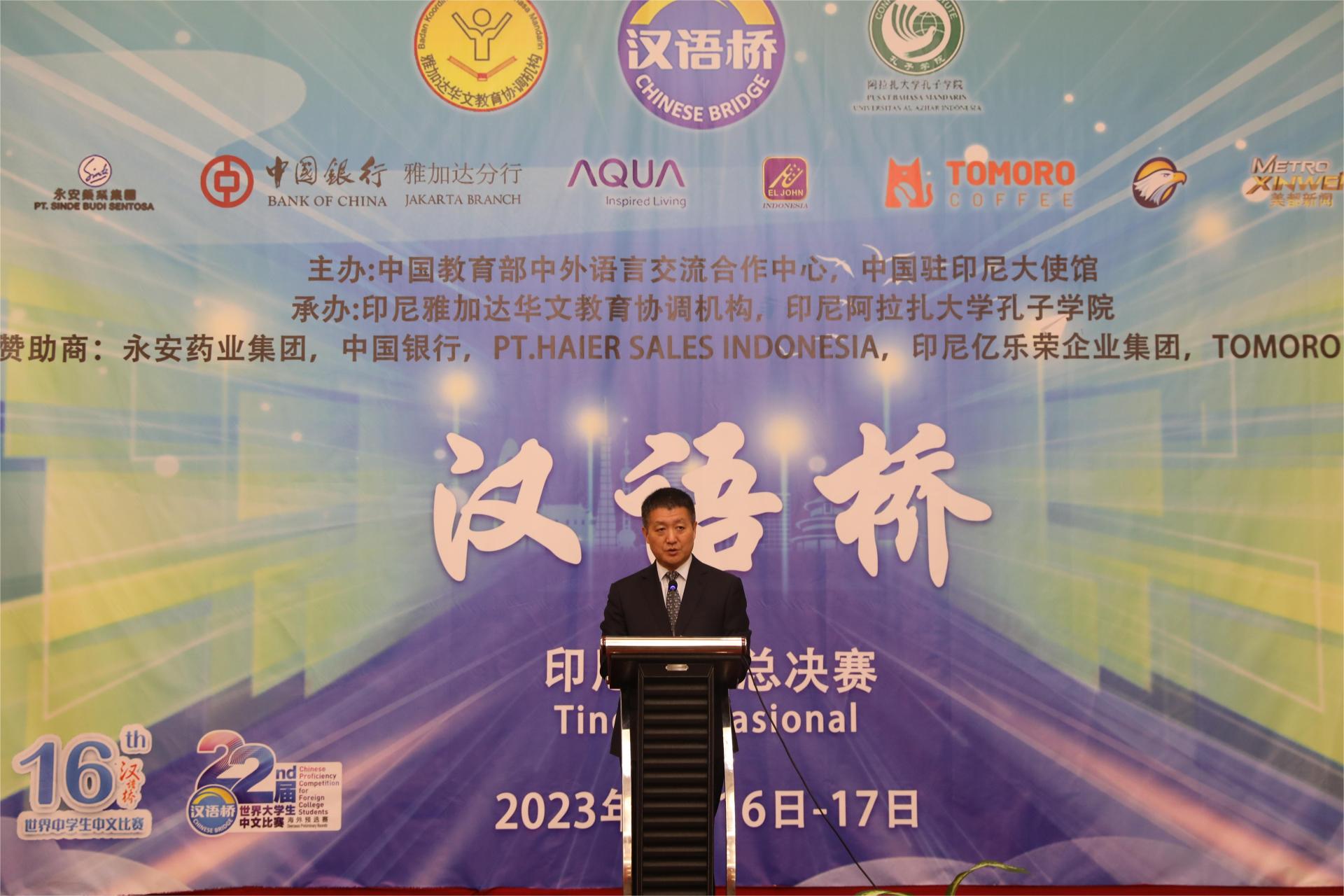 很高兴出席第三届“汉语桥”小学生、第十六届“汉语桥”中学生和第二十二届“汉语桥”大学生中文比赛印尼赛区总决赛颁奖典礼。首先,我谨代表中国驻印尼使馆对比赛的成功举办和获奖选手表示热烈的祝贺,对筹备此次大赛的雅加达华文教育协调机构、阿拉扎大学孔子学院表示衷心的感谢,向辛勤辅导的老师们表示诚挚的敬意。