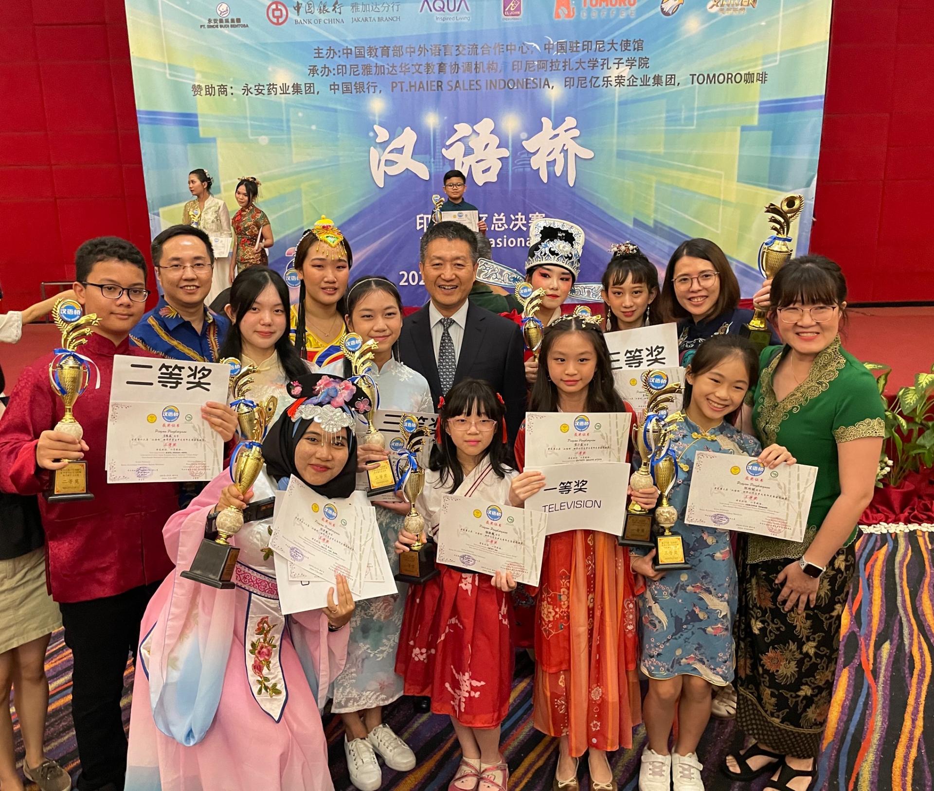 此次比赛由中外语言交流合作中心、中国驻印尼使馆主办,印尼雅加达华文教育协调机构、阿拉扎大学孔子学院承办。来自印尼12个省的77名选手参加了比赛。经过紧张激烈的角逐,苏北省的黄子嘉、东爪哇省的陈书缘获得小学组一等奖;东爪哇省的陈嬿伊获得中学组一等奖;苏北省的邓棻璘获得大学组一等奖。陆慷大使为一等奖获奖选手及最佳辅导老师颁发了奖状和奖杯,并鼓励获奖选手在赴中国参加汉语桥全球总决赛中再创佳绩。