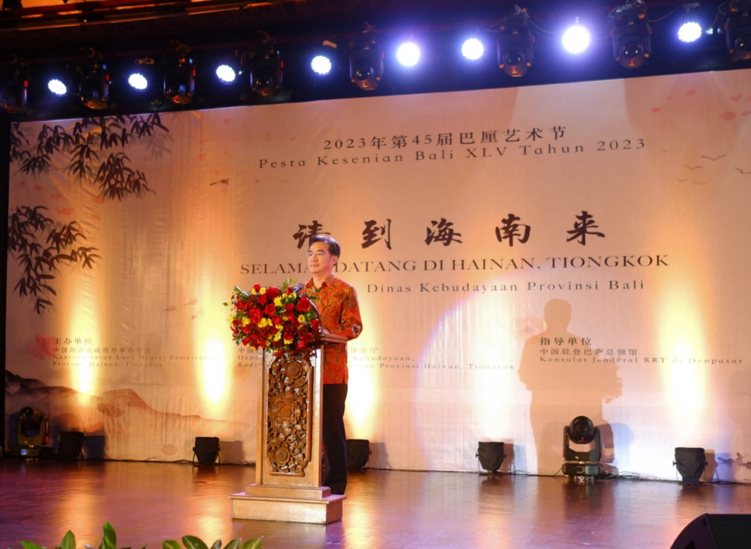 据中华人民共和国驻登巴萨总领事馆7月5日消息,2023年7月4日,朱兴龙总领事出席第45届巴厘艺术节海南师范大学艺术团专场演出并致辞。巴厘省文化局局长苏吉尔达、伍拉莱移民局局长苏吉多、建设规划署署长维斯达那等政要出席,当地观众200余人观看了演出。