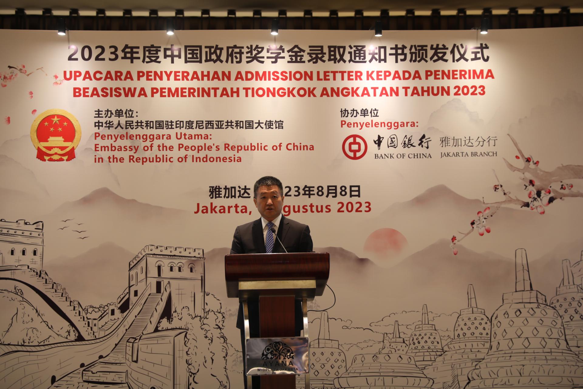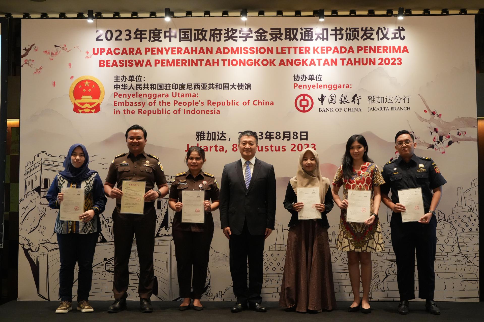 据中华人民共和国驻印度尼西亚大使馆8月9日消息,2023年8月8日,由中国驻印尼使馆举办的2023年度中国政府奖学金录取通知书颁发仪式在雅加达举行。陆慷大使、雅加达特区省检察院检察长瑞达、印尼总检察院人事司代表艾高、伊斯兰教士联合会高等教育机构代表露缇妮、伊联大学(日惹)校长威德亚、印尼华裔总会总主席黄德新、印尼雅加达华文教育协调机构执行主席蔡昌杰、中国银行雅加达分行行长张朝阳、50名奖学金获得者及其老师和家人、中印尼媒体记者等近200人出席。