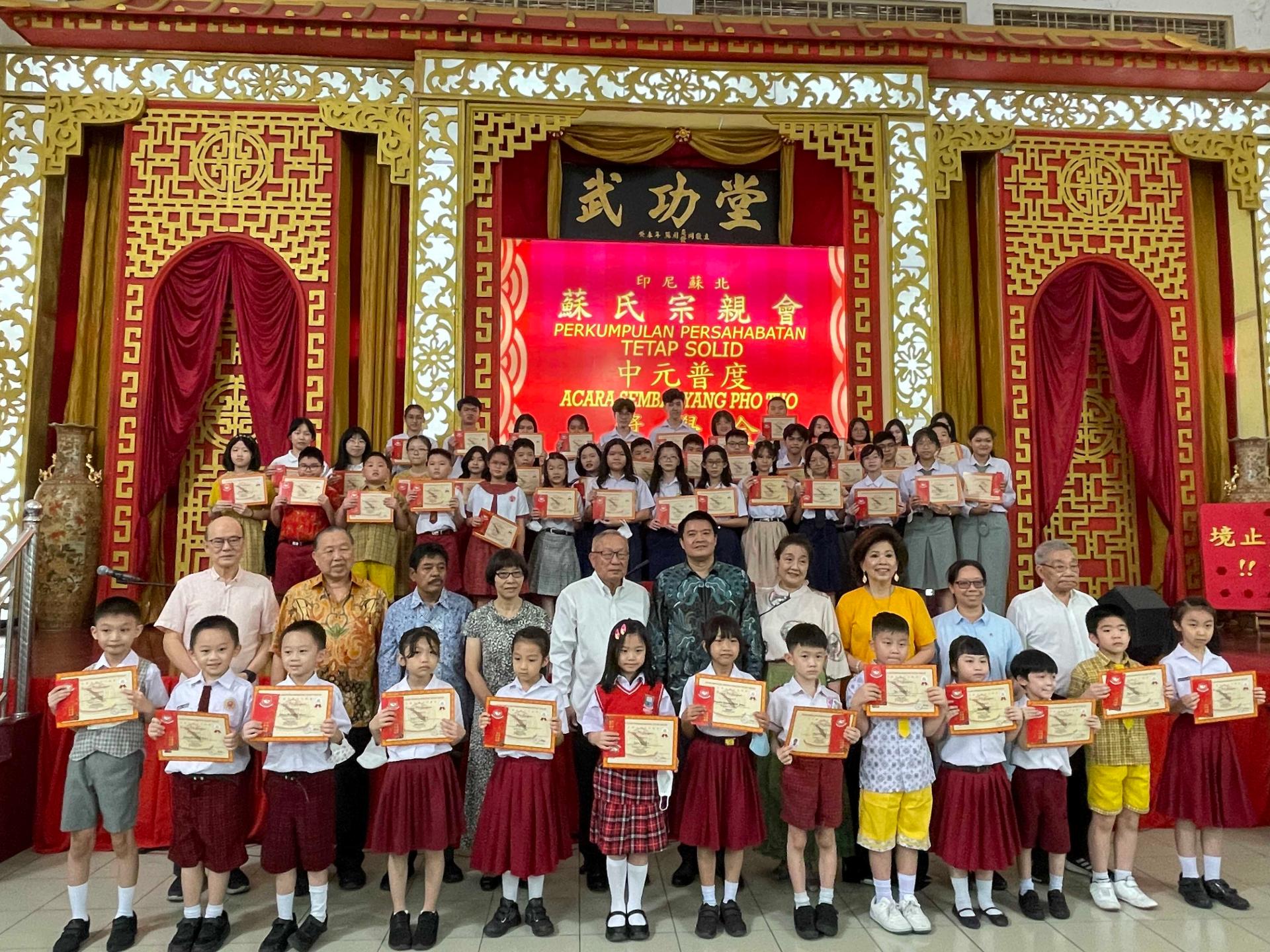 张总与苏用发理事长共同为宗亲会优秀汉语学生颁发奖学金和荣誉证书。