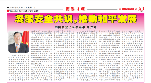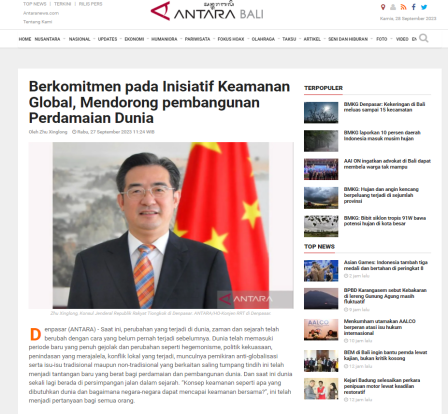 据中华人民共和国驻登巴萨总领事馆9月28日消息,2023年9月26日、27日,驻登巴萨总领事朱兴龙就全球安全倡议在印尼主流印尼文、华文媒体《巴厘邮报》、安塔拉通讯社巴厘分社、《西努沙登加拉之声》、《古邦邮报》、《国际日报》和《千岛日报》发表署名文章《凝聚安全共识,推动和平发展》。全文如下: