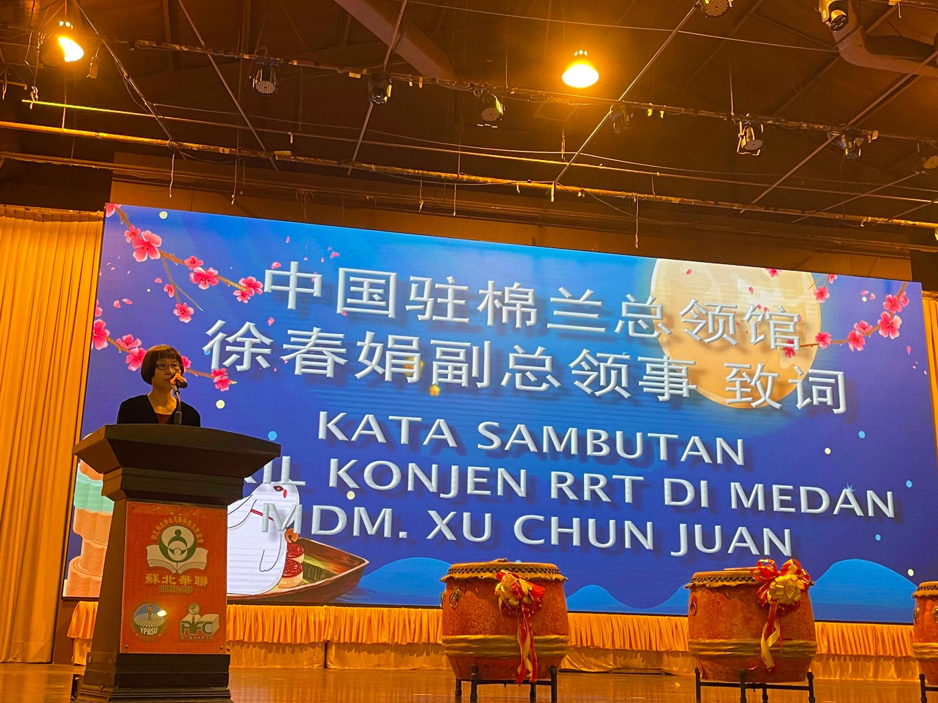 据中华人民共和国驻棉兰总领事馆9月25日消息,9月23日,驻棉兰总领馆徐春娟副总领事应邀出席苏北华社联谊会举办的中华传统文化暨美食节活动,共同庆祝中华民族传统节日—中秋节。苏北华联理事会主席苏用发、执行主席徐煜权等出席活动。