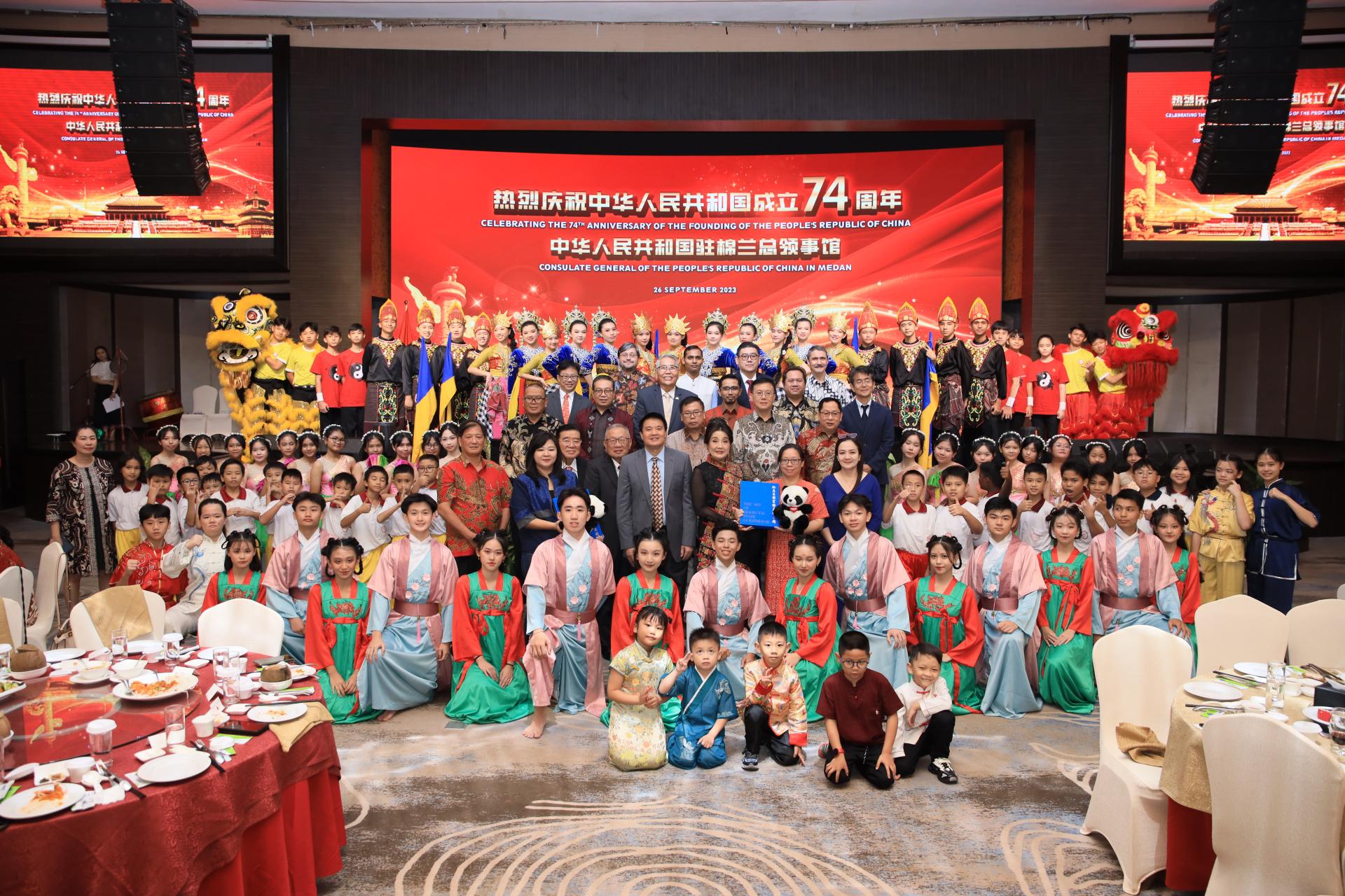 据中华人民共和国驻棉兰总领事馆9月27日消息,9月26日,中国驻棉兰总领馆举办国庆招待会,热烈庆祝中华人民共和国成立74周年。张敏总领事出席并致辞。北苏门答腊省、西苏门答腊省和南苏门答腊省政府代表、棉兰市政府代表、印尼国会议员陈金扬、棉兰市议长黄建霖、苏北省前省长艾迪中将等政要,苏北华联理事会主席苏用发和执行主席徐煜权等华社负责人,以及领区各级地方政府、工商界、宗教、媒体、高校、外国驻棉兰领团代表以及中资企业、华侨华人等700余人出席。