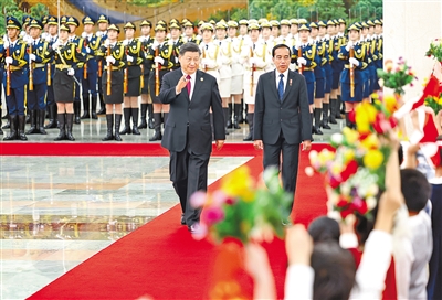 会谈前,习近平在人民大会堂北大厅为佐科举行欢迎仪式,陪同佐科检阅中国人民解放军仪仗队,并观看分列式。