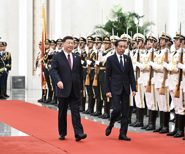 会谈前,习近平在人民大会堂北大厅为佐科举行欢迎仪式,陪同佐科检阅中国人民解放军仪仗队,并观看分列式。