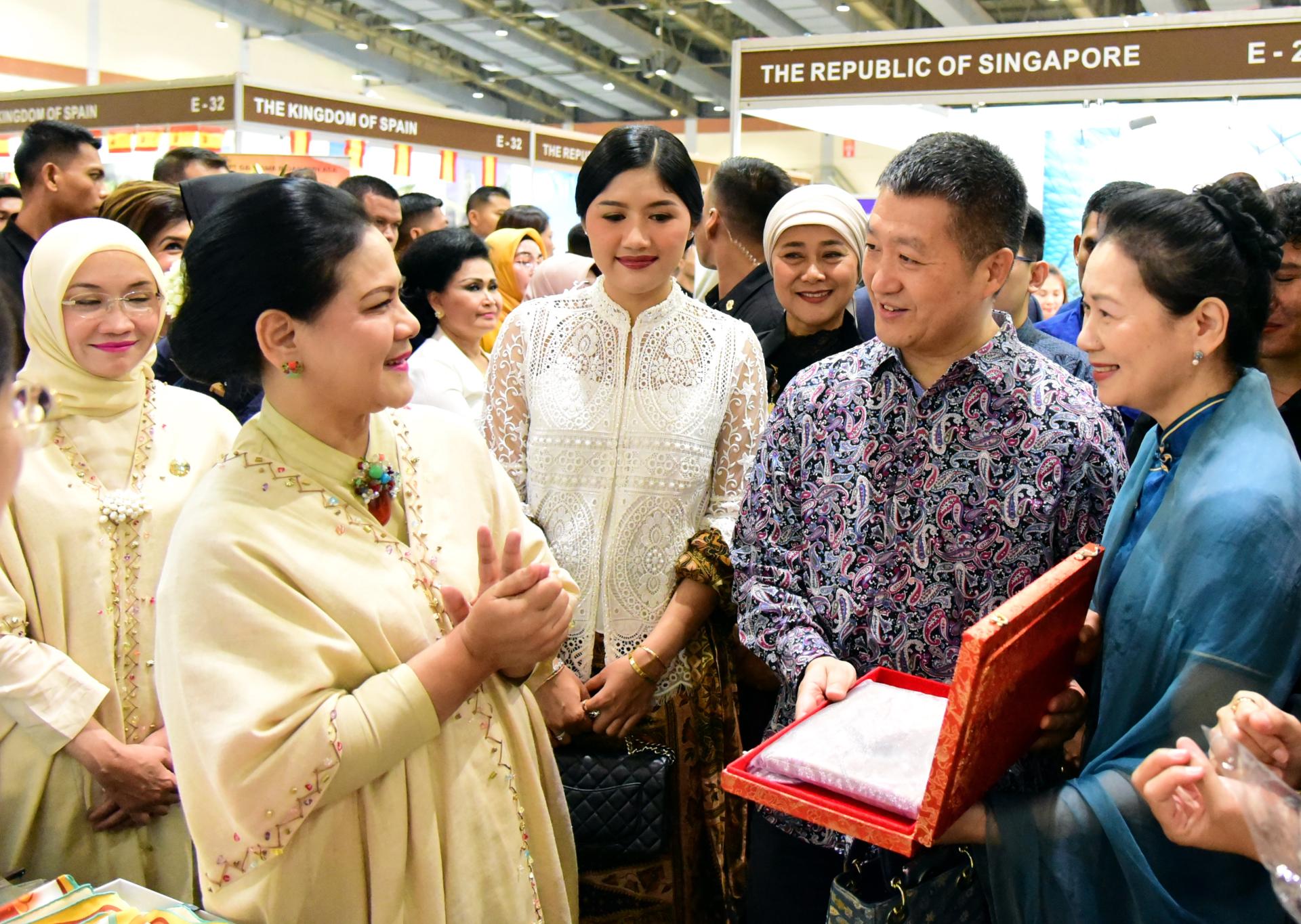 总统夫人伊莉亚娜在开幕式后亲临中国展位。陆慷大使夫妇向总统夫人介绍中国特色商品,伊莉亚娜夫人感谢中国使馆为此次义卖成功举办及印尼慈善事业所作贡献,并愉快谈起上月对北京的访问。总统夫人及随行人员还在中国展位精心选购刺绣团扇、茶具、熊猫玩偶等商品,奉献爱心。