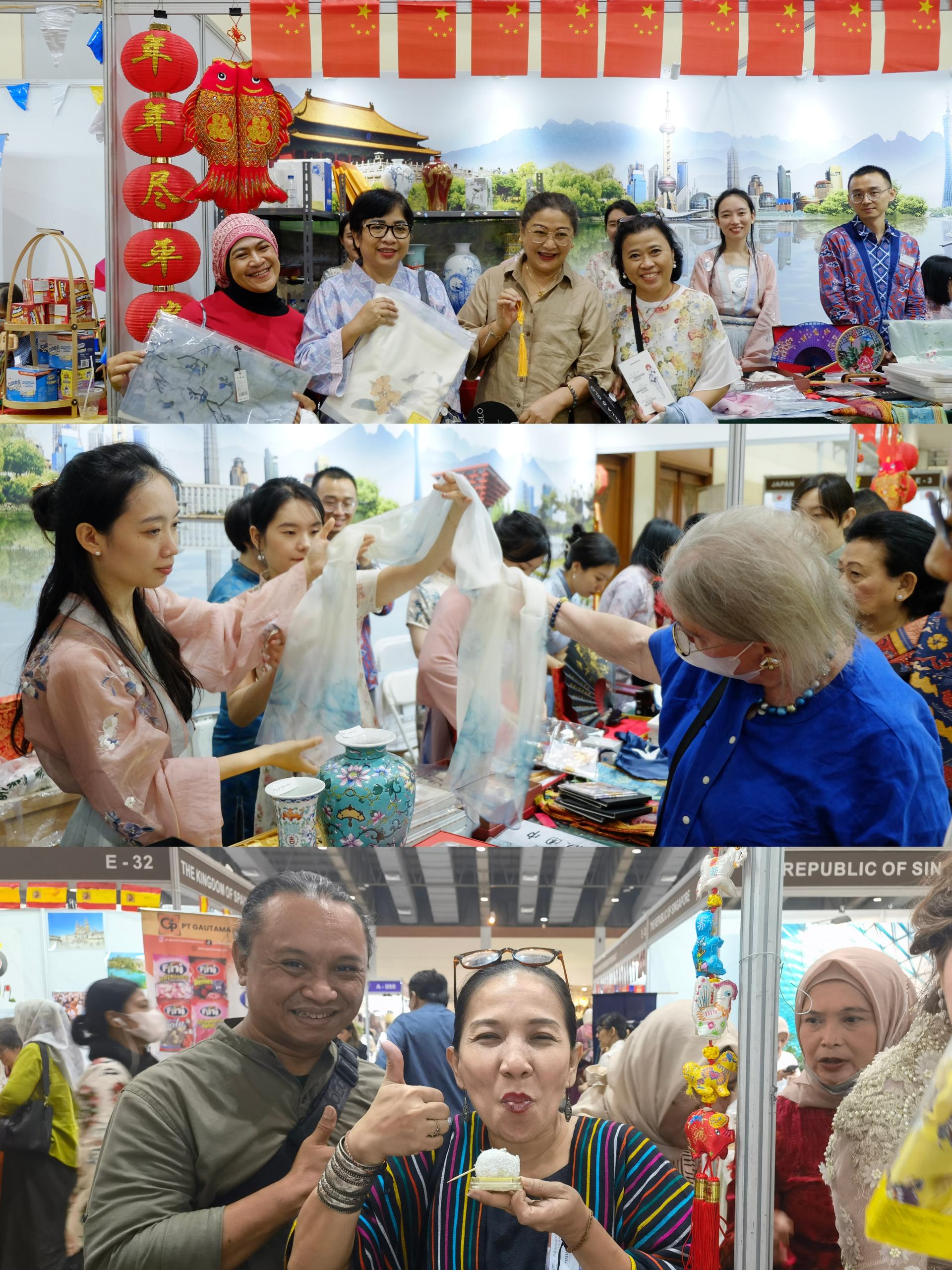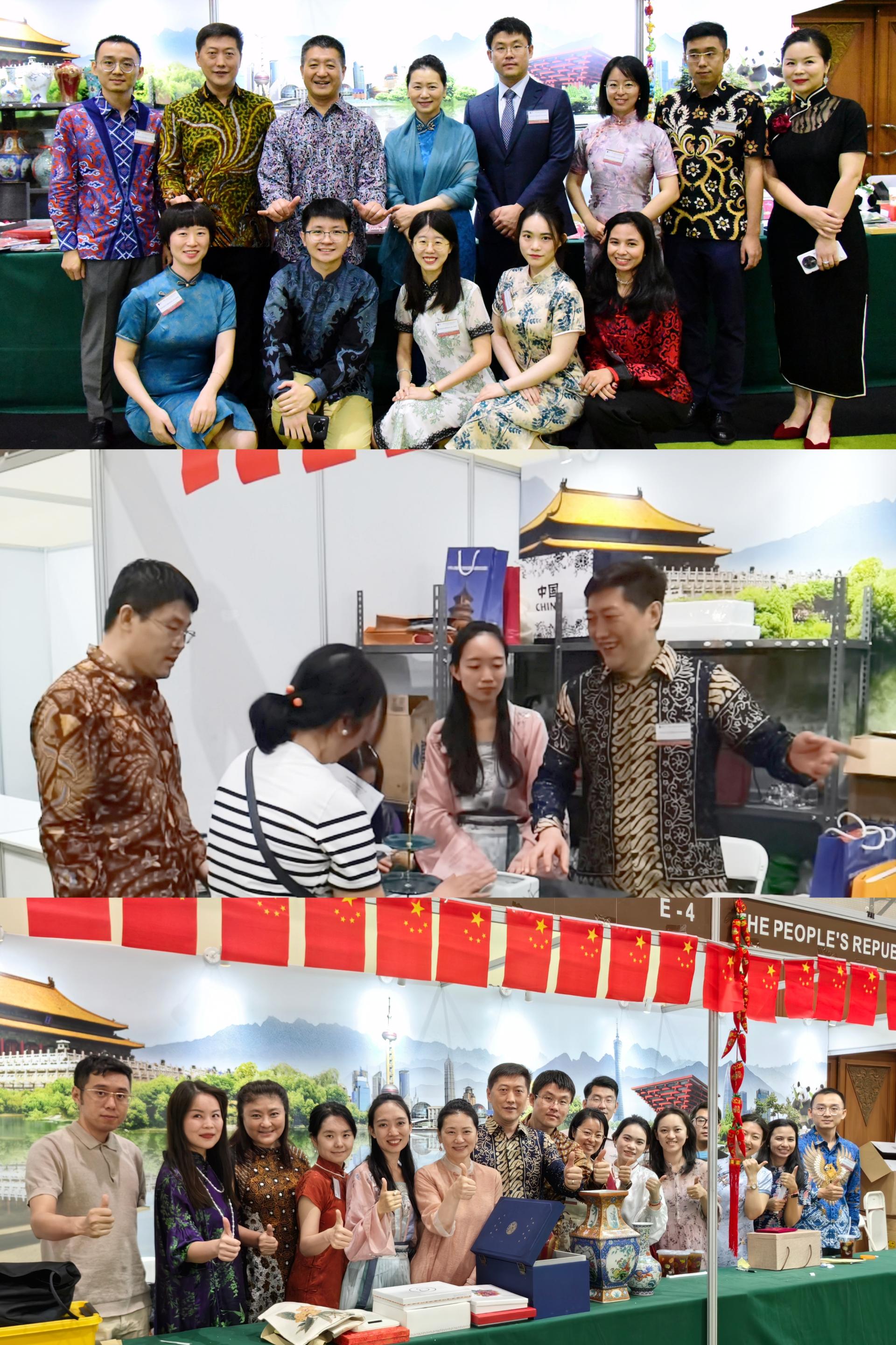 义卖活动现场人潮涌动、气氛热烈。中国使馆展位以中国式现代化主题展板为背景,精心布置的五星红旗、大红灯笼等彰显浓郁中国元素。琳琅满目的特色商品、使馆厨师自制的中华美食受到印尼当地民众和各国外交人员的热烈欢迎,大家纷纷欣赏挑选,慷慨解囊。
