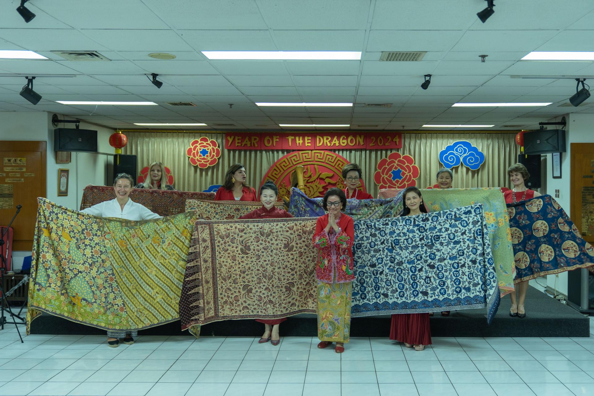 陈悦参赞及其他大使夫人们受邀上台展示具有中国特色的印尼巴迪蜡染布收藏品,并与嘉宾们互致新年快乐。现场气氛热烈,年味十足。