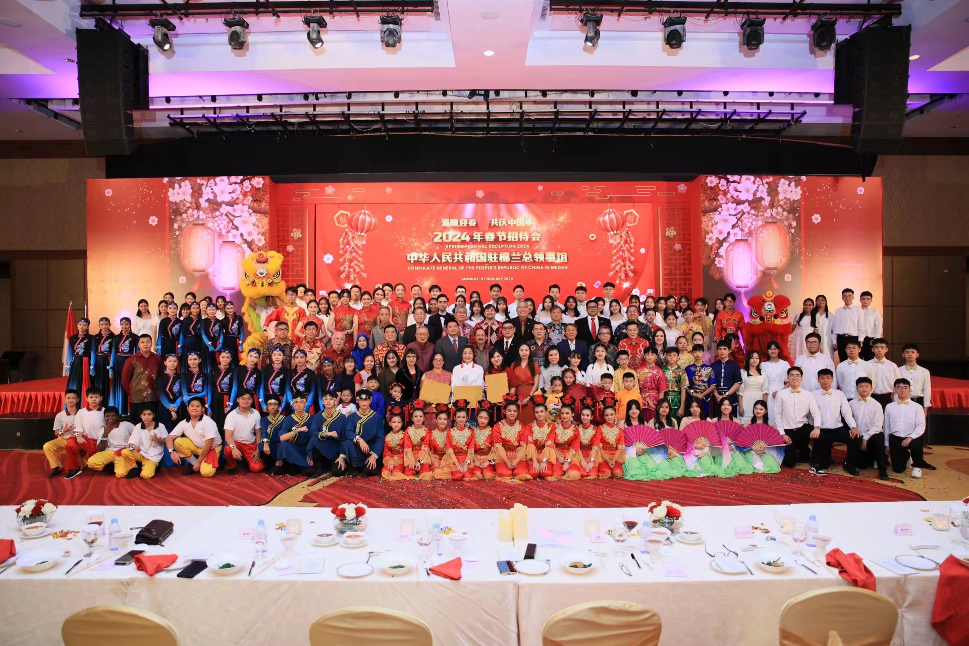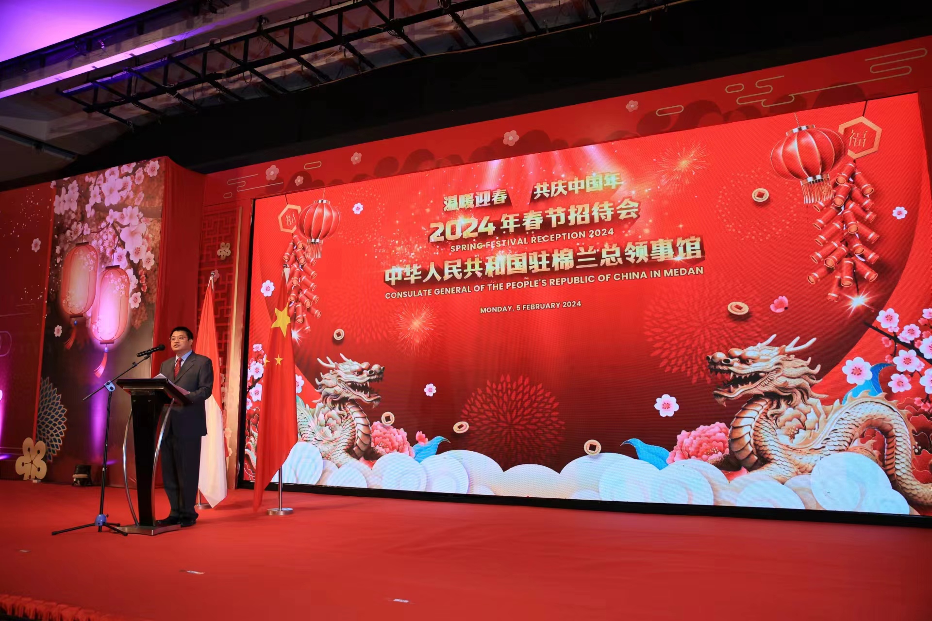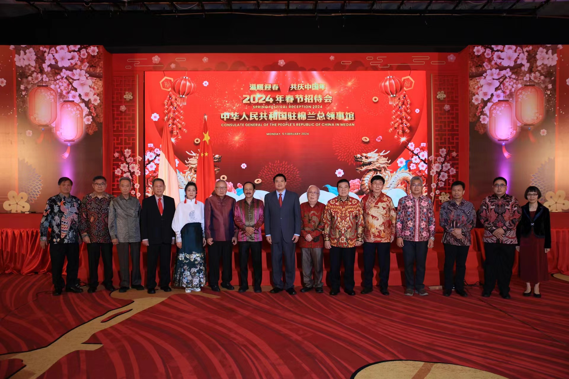 据中华人民共和国驻棉兰总领事馆2月6日消息,2月5日,中国驻棉兰总领馆举办“温暖迎春·共庆中国年”春节招待会。张敏总领事出席并致辞,徐春娟副总领事和总领事夫人刘宇清等参加。苏北省政府秘书长努格罗赫、苏北省议会代表、棉兰市政府和议会代表,苏北华联理事会主席苏用发和执行主席徐煜权、印尼华裔总会执行主席黄印华,领区工商、媒体、高校、驻棉兰领团等各界代表,以及中资企业、中国留学生和汉语教师代表等400余人欢聚一堂,共庆佳节。