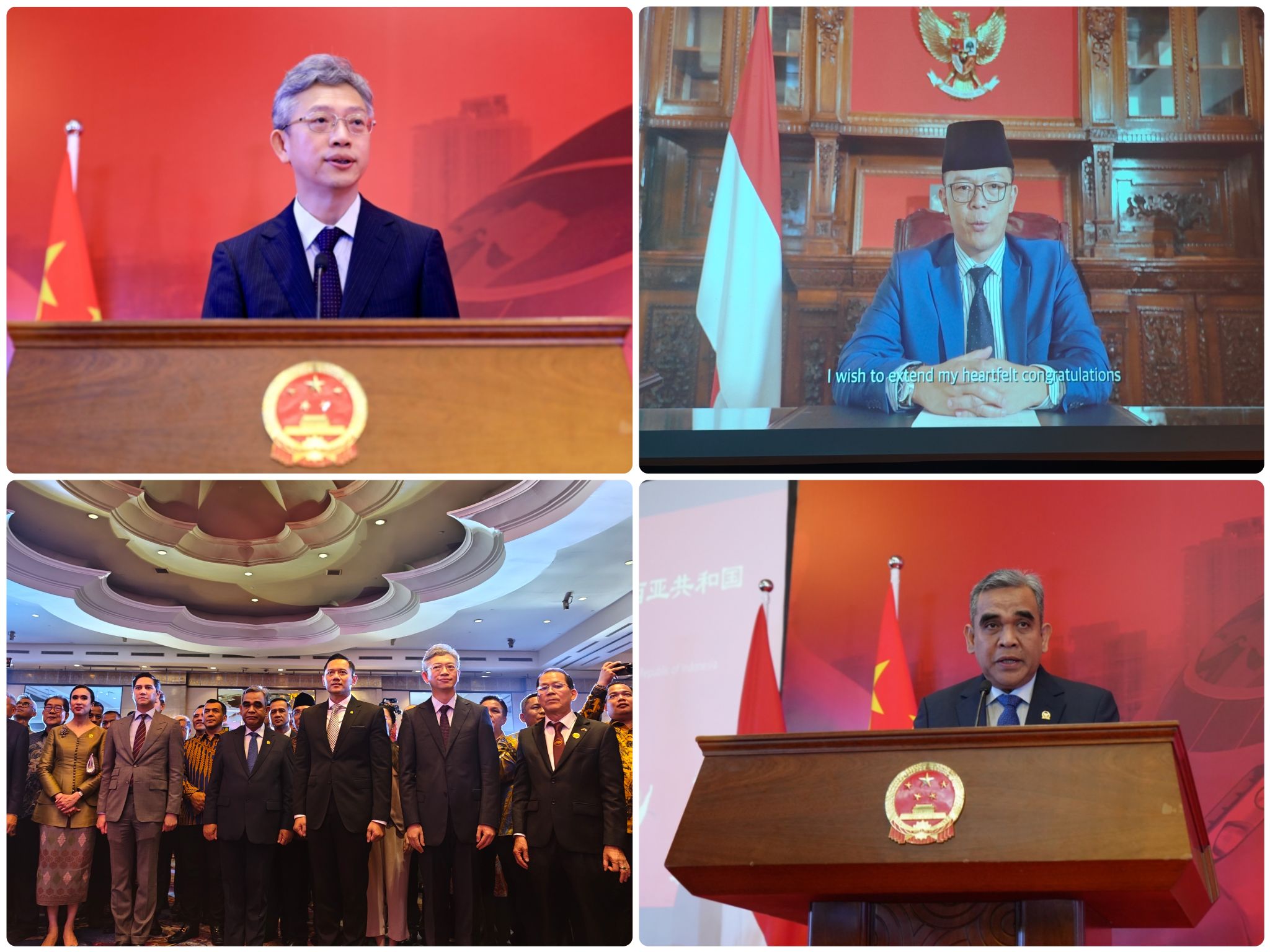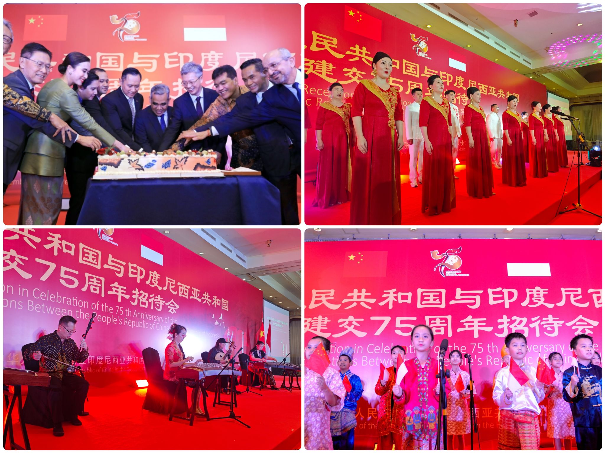 4月17日晚,中国驻印尼使馆举办招待会,隆重庆祝中印尼建交75周年。印尼人民协商会议主席穆扎尼、基础设施与区域发展统筹部长阿古斯、投资与下游化部长罗山、旅游部长普特丽、劳工部长亚斯耶尔利、人口流动部长伊夫提塔赫、国家检验检疫局长萨哈特等政府高官,国会第一委员会主席乌杜,伊斯兰教士联合会总主席叶赫亚,以及各国驻印尼使节,中资企业、汉语教师、华侨华人代表等近千人出席。印尼外长苏吉约诺视频致辞。