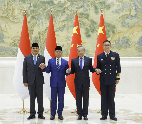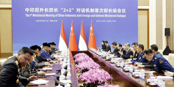2025年4月21日,中共中央政治局委员、外交部长王毅和国防部长董军与印尼外长苏吉约诺、防长沙夫里共同主持中印尼外长防长“2+2”对话机制首次会议。