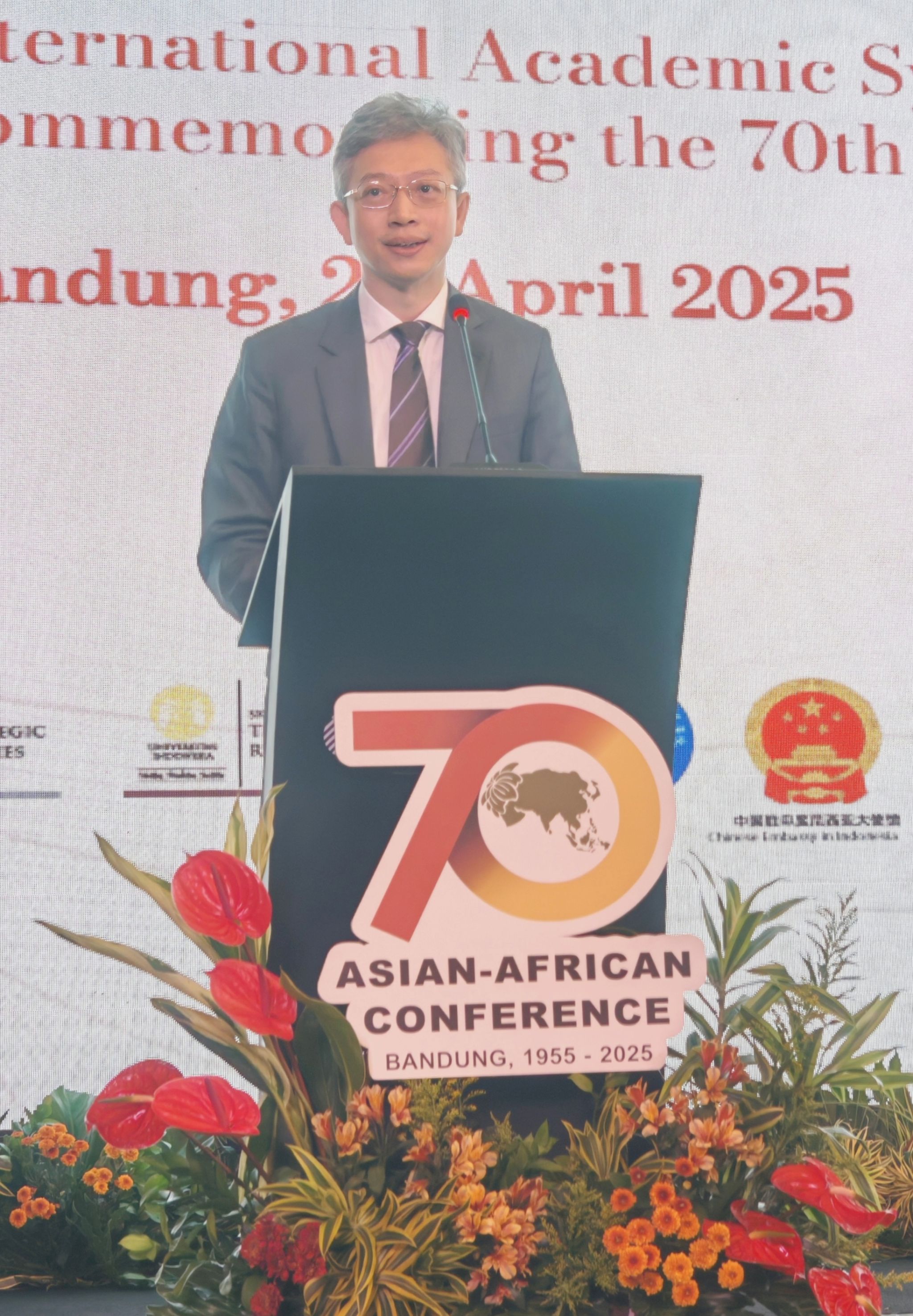 4月24日,驻印尼使馆同复旦大学、印尼大学在印尼西爪哇省万隆市共同举办“万隆精神70周年:在全球挑战中强化全球南方发展”研讨会。王鲁彤大使出席并作主旨演讲。印尼国家经济委员会主席卢胡特、副外长阿里夫、旅游和创意经济部副部长恰恰普、印尼驻华大使周浩黎、印度驻印尼大使桑迪普、印尼大学校长赫里、复旦大学国际关系和公共事务学院院长苏长和等嘉宾致辞。来自亚非国家的专家学者及印尼各界人士400余人出席。