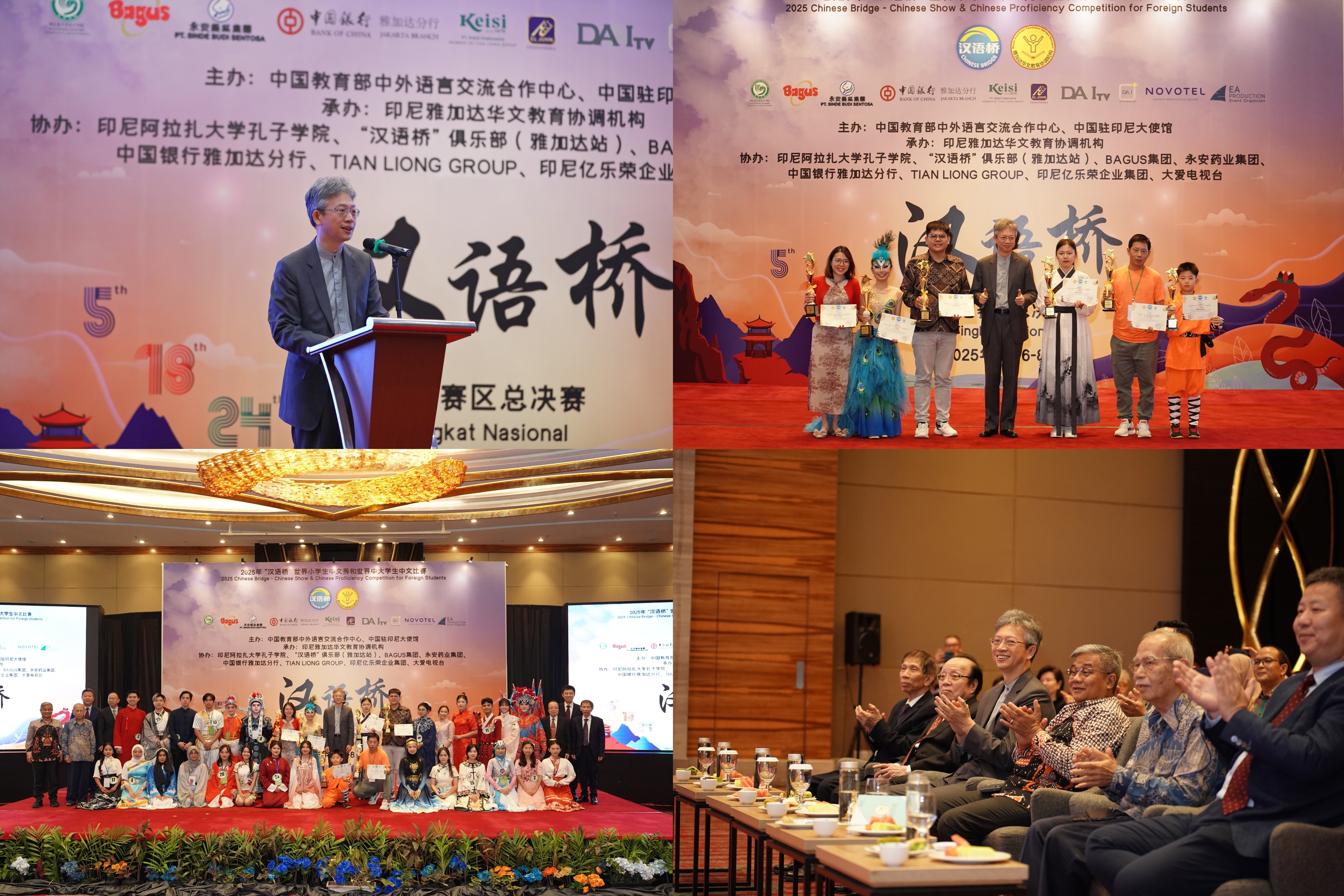王大使在致辞中表示,“汉语桥”自诞生以来,已成为中印尼人文交流的重要品牌。“汉语桥”中文比赛不仅是语言竞赛,更是文化交流的盛会。在这里,中印尼文化相互交融、互鉴,“汉语桥”搭建起促进两国民心相通,助力构建中印尼命运共同体的桥梁。中国驻印尼大使馆将继续与印尼各界合作,为大家提供更多学习汉语、了解中国的机会。