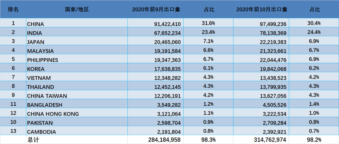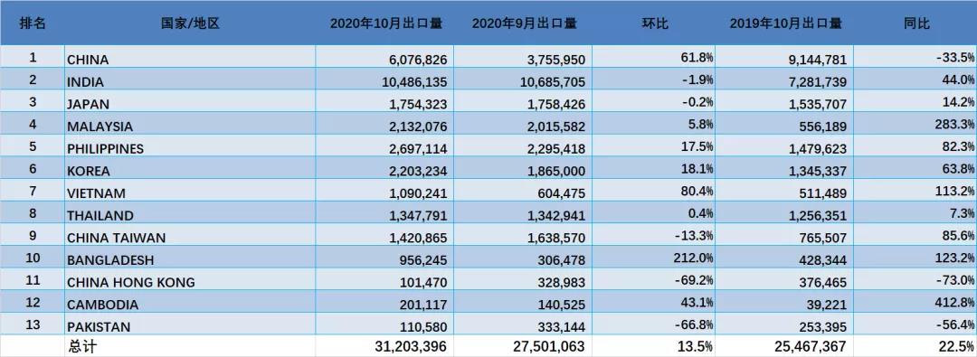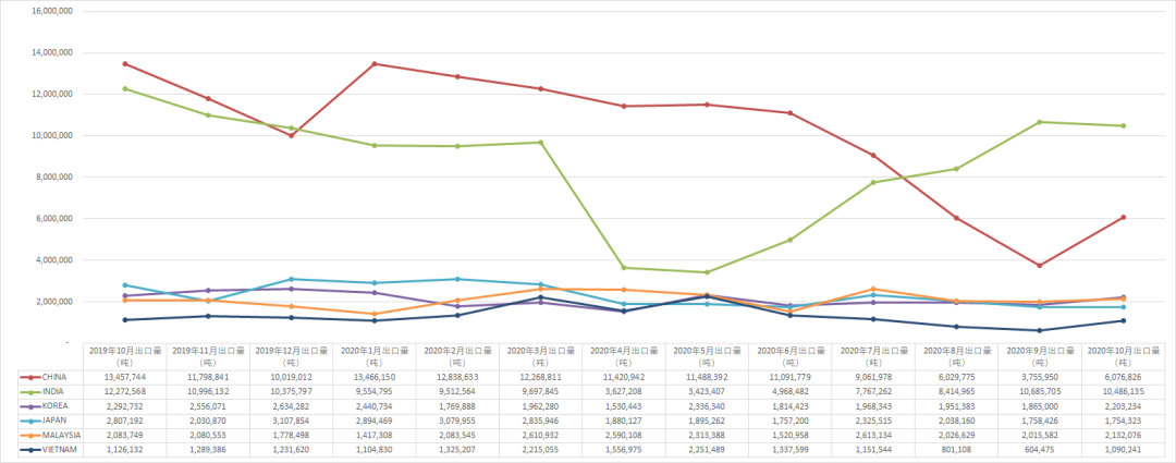 从图中可以看出,2020年前10月,中国由于进口限制稍有放开,进口量已出现反弹。印度受疫情影响关闭的港口部分重新开启,进口量已出现反弹。其他国家进口量则是不同幅度的增长或下降。