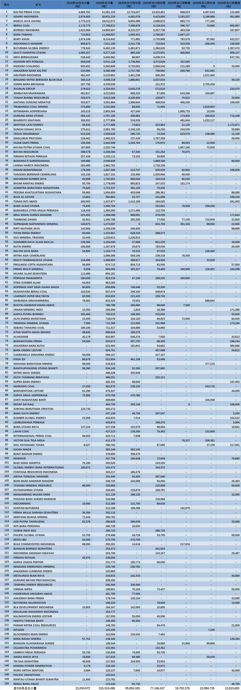 此表格统计了印尼前150大煤矿在2020年前10个月的煤炭出口量以及对应的出口国,从图中可以看出,稳居前5名的煤矿依然是KPC, Adaro,Berau Coal, Kideco和 BIB。