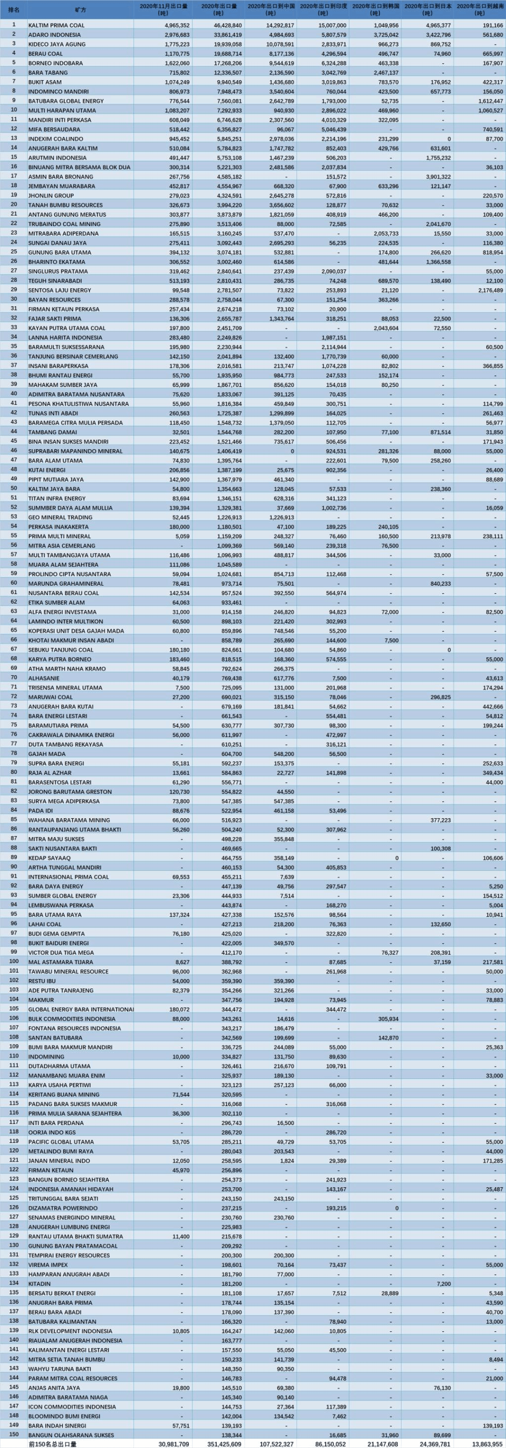 此表格统计了印尼前150大煤矿在2020年前11个月的煤炭出口量以及对应的出口国,从图中可以看出,稳居前5名的煤矿依然是KPC, Adaro,Berau Coal, Kideco和 BIB。