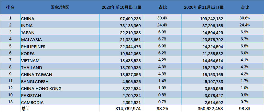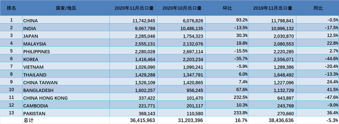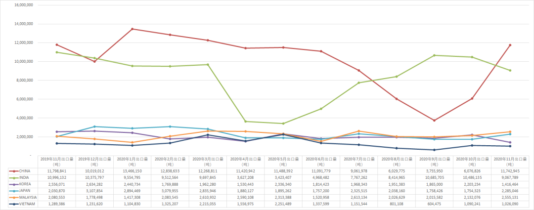 从图中可以看出,2020年前11月,中国由于进口限制放开,进口量已出现大幅反弹。印度受疫情影响,进口量稍有回落。其他国家进口量则是不同幅度的增长或下降。