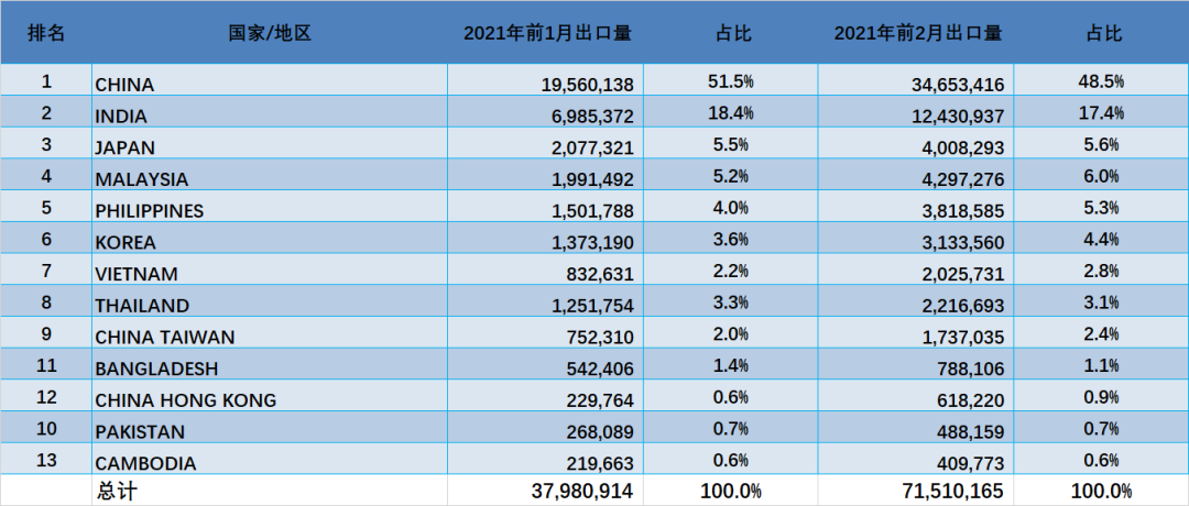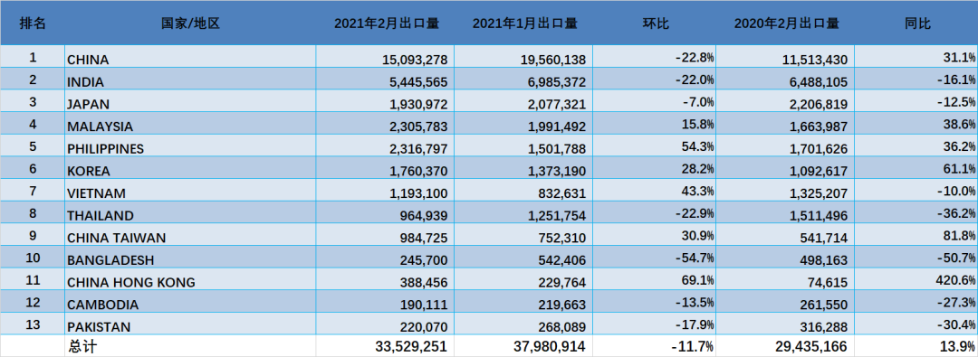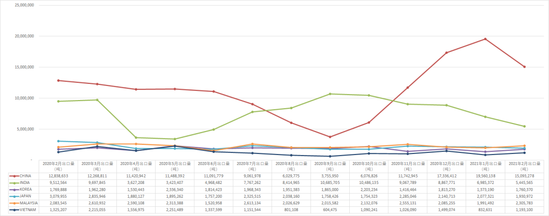 从图中可以看出,中国由于新年以及价格原因,进口量出现回落。印度受疫情影响,进口量则是持续下降。其他国家进口量则是不同幅度的增长或下降。