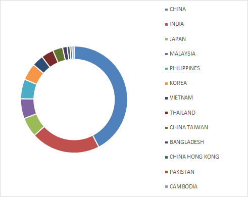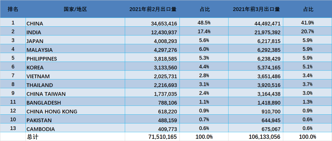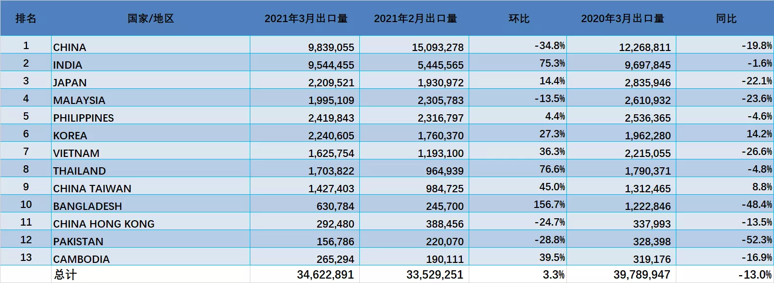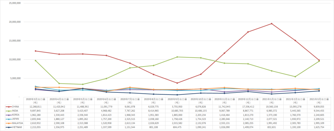 从图中可以看出,中国进口量出现持续回落,印度进口量已出现反弹,其他国家进口量则是不同幅度的增长或下降。