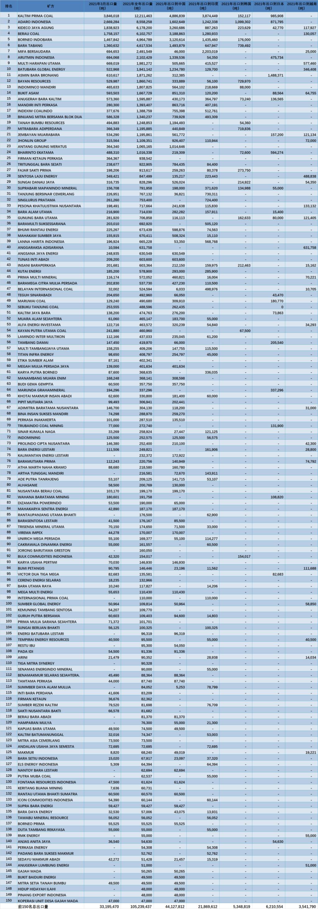 此表格统计了印尼前150大煤矿在2021年3月的煤炭出口量以及对应的出口国。