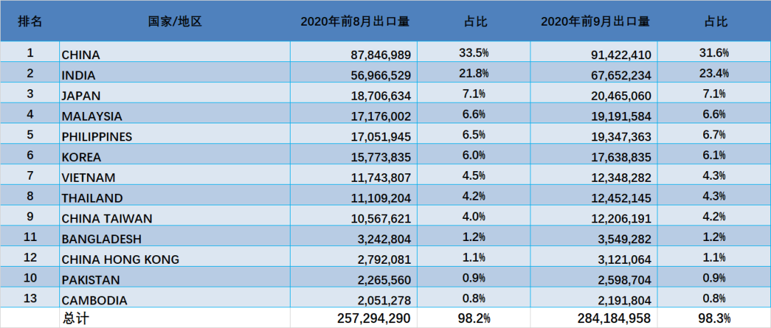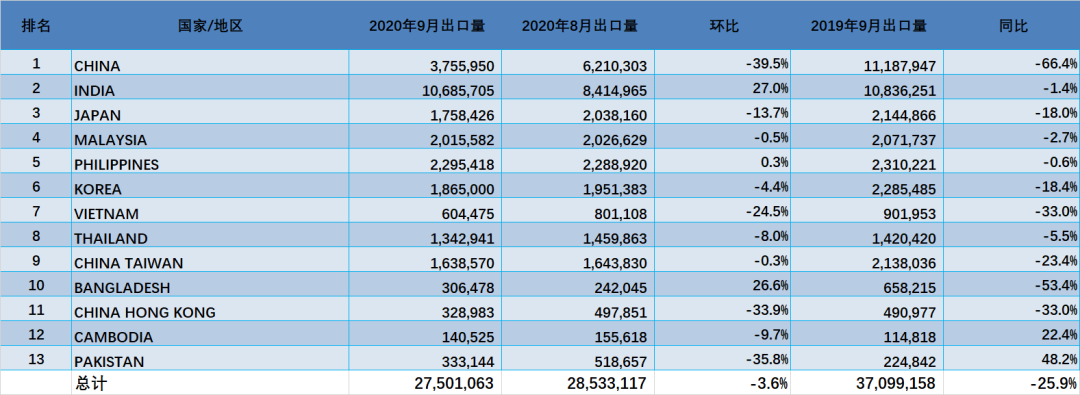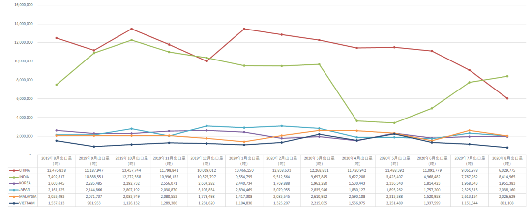 从图中可以看出,2020年前9月,中国进口量持续递减,目前疫情和价格已经略有好转,但是依然受进口限制影响。印度受疫情影响关闭的港口部分重新开启,进口量已出现反弹。其他国家进口量均因为疫情影响出现不同幅度的下降。