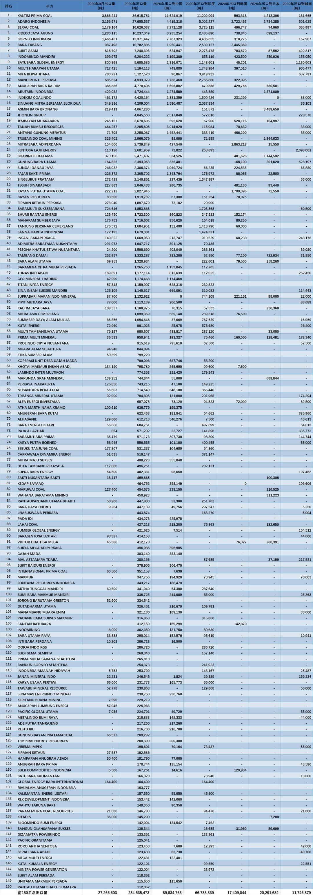 此表格统计了印尼前150大煤矿在2020年前9个月的煤炭出口量以及对应的出口国,从图中可以看出,稳居前5名的煤矿依然是KPC,Adaro,Berau Coal,Kideco和BIB。