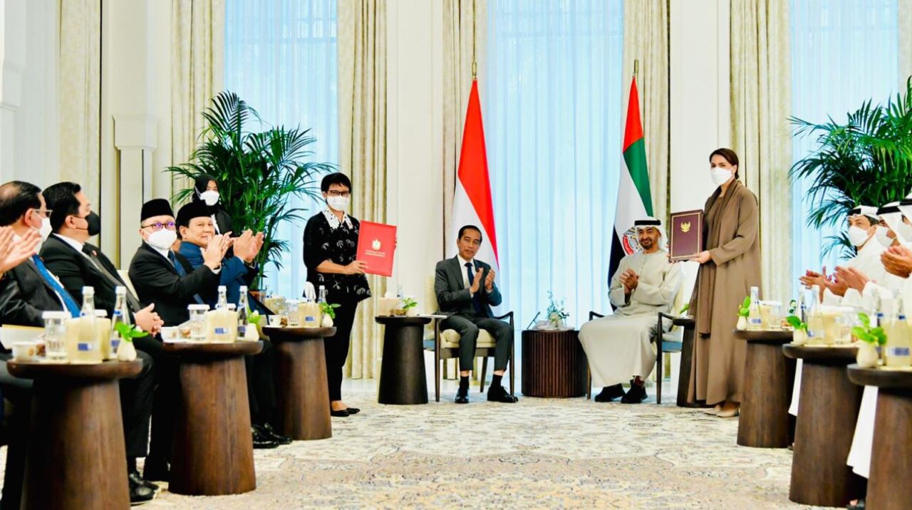 当地时间7月1日,印尼总统佐科到访阿联酋同穆罕默德·本·扎耶德·阿勒纳哈扬(Mohamed Bin Zayed Al-Nahyan)总统举行会谈,期间在双方领导人共同见证下,签署了《印度尼西亚-阿拉伯联合酋长国全面经济伙伴关系协定》(IUAE-CEPA),此外双方其他谅解备忘录也一同进行换文,即: