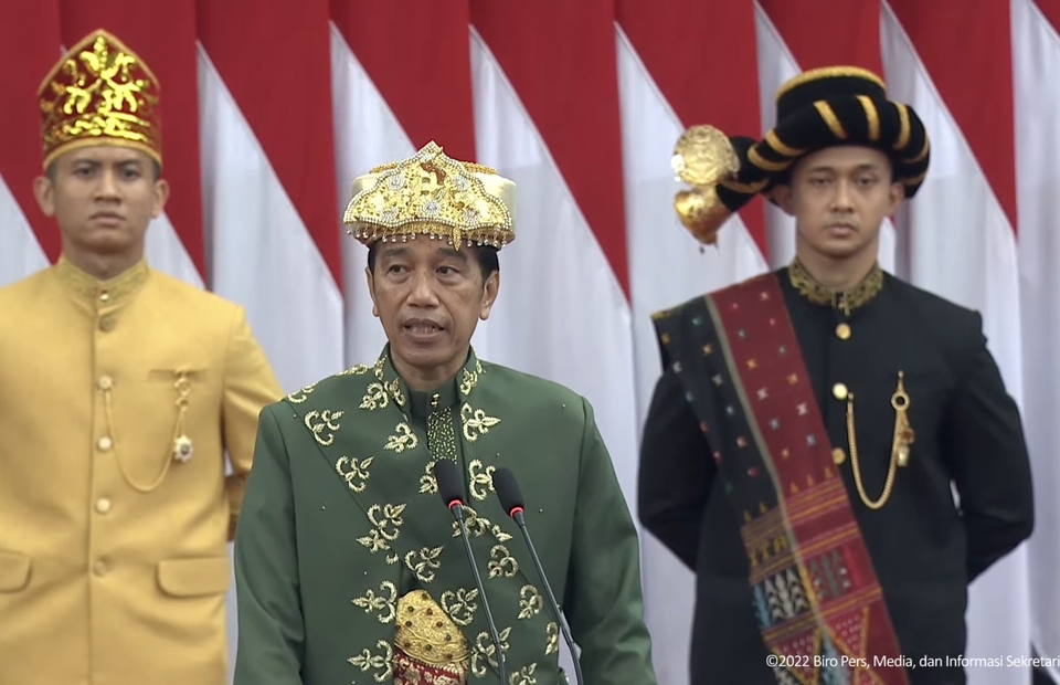 据《雅加达邮报》8月16日消息,印尼总统佐科出席在雅加达努山达拉(Nusantara)大楼举行的人协年度会议并发表国情咨文。像往年一样,佐科在年度会议上的“装束”将成为头条新闻,其将身着传统服饰参加年会视为展示印尼文化多样性的机会。今年佐科穿着来自邦加勿里洞省的Paksian服饰出现,套装包括一件带有金色细节的苔绿色长袖上衣和一条红金色围裙,以及一个金色头巾。佐科说道,“小竹尖”(pucuk rebung)图案象征着和谐,绿色代表着宁静、希望和成长。