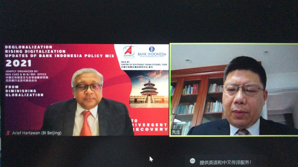 2021年8月24日上午10:30,由中国社会科学院亚太与全球战略研究院与印尼中央银行驻北京代表处共同举办,中国社科院东南亚研究中心承办的“全球化趋弱、数字经济蓬勃发展背景下,印尼央行货币政策框架新动态”视频研讨会在线举行,本次研讨会由印尼中央银行北京代表处首席代表Arief Hartawan先生(阿里耶夫·哈达旺)主讲,中国社科院东南亚研究中心主任许利平先生主持,包括我校中印尼人文交流中心在内的多所高校及研究机构相关人员参与了本次研讨会。我校中印尼人文交流中心主任韦红教授、赵长峰教授、王勇辉副教授、刘明周副教授、张弦副教授、副主任陈菲副教授,以及中心研究助理赖昶、冷青松、李元、李珍、昂格才让、陈灵芝参加了本次视频研讨会。