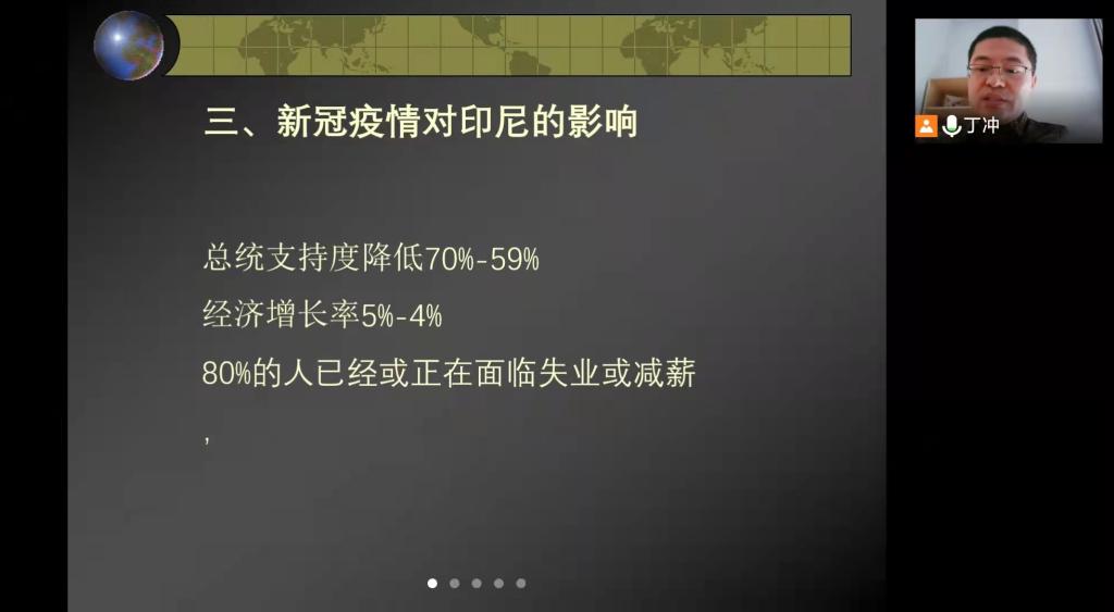 首先,丁冲老师介绍了印度尼西亚当前的疫情形势,指出新冠疫情对印尼影响重大,造成印尼国内经济增长缓慢,有约80%民众已经或正在面临失业与减薪困境。而在回顾印尼抗疫全程后,丁冲老师指出观念、宗教、医疗资源匮乏等原因造成印尼疫情形势持续恶化,死亡率居高不下。但中印尼两国抗疫合作出色,中方提供的大量疫苗为印尼应对疫情发挥了重要作用,同时中国愿同印尼推进新冠疫苗研发的做法不仅是两国战略互信的体现,更是提升了两国人民健康福祉。